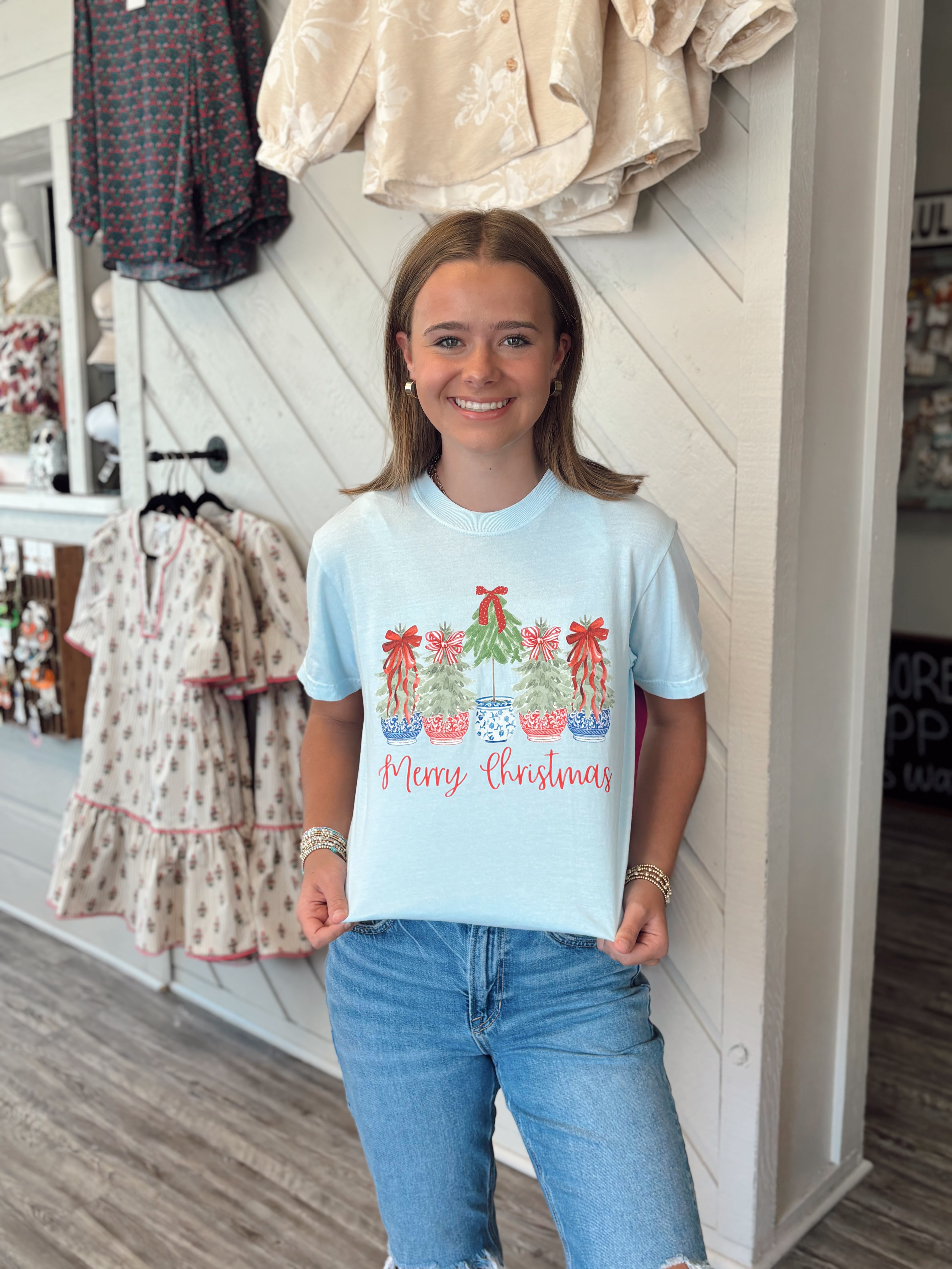Spread a little holiday cheer in our Merry Christmas Topiary Tee! This adorable Comfort Colors tee features a festive lineup of watercolor-style topiaries in red and green pots with pretty holiday bows and the phrase “Merry Christmas” in cheerful red script. Perfect for cozying up during the holiday season, Christmas shopping, or a casual festive outfit.