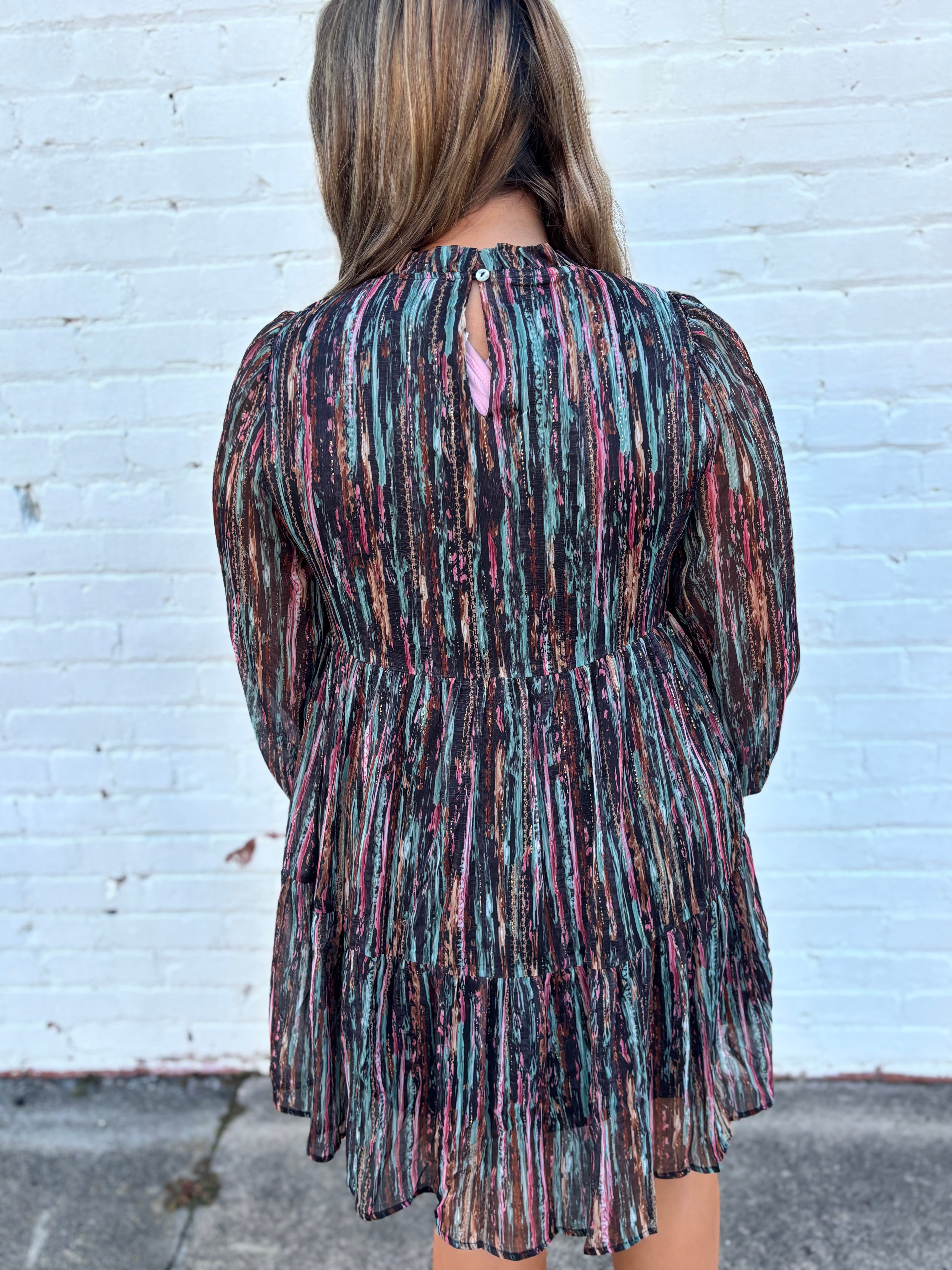 The subtle shimmer and painterly stripes make it a perfect choice for holiday gatherings, date nights, or special occasions where you want to stand out with sophistication and ease.
