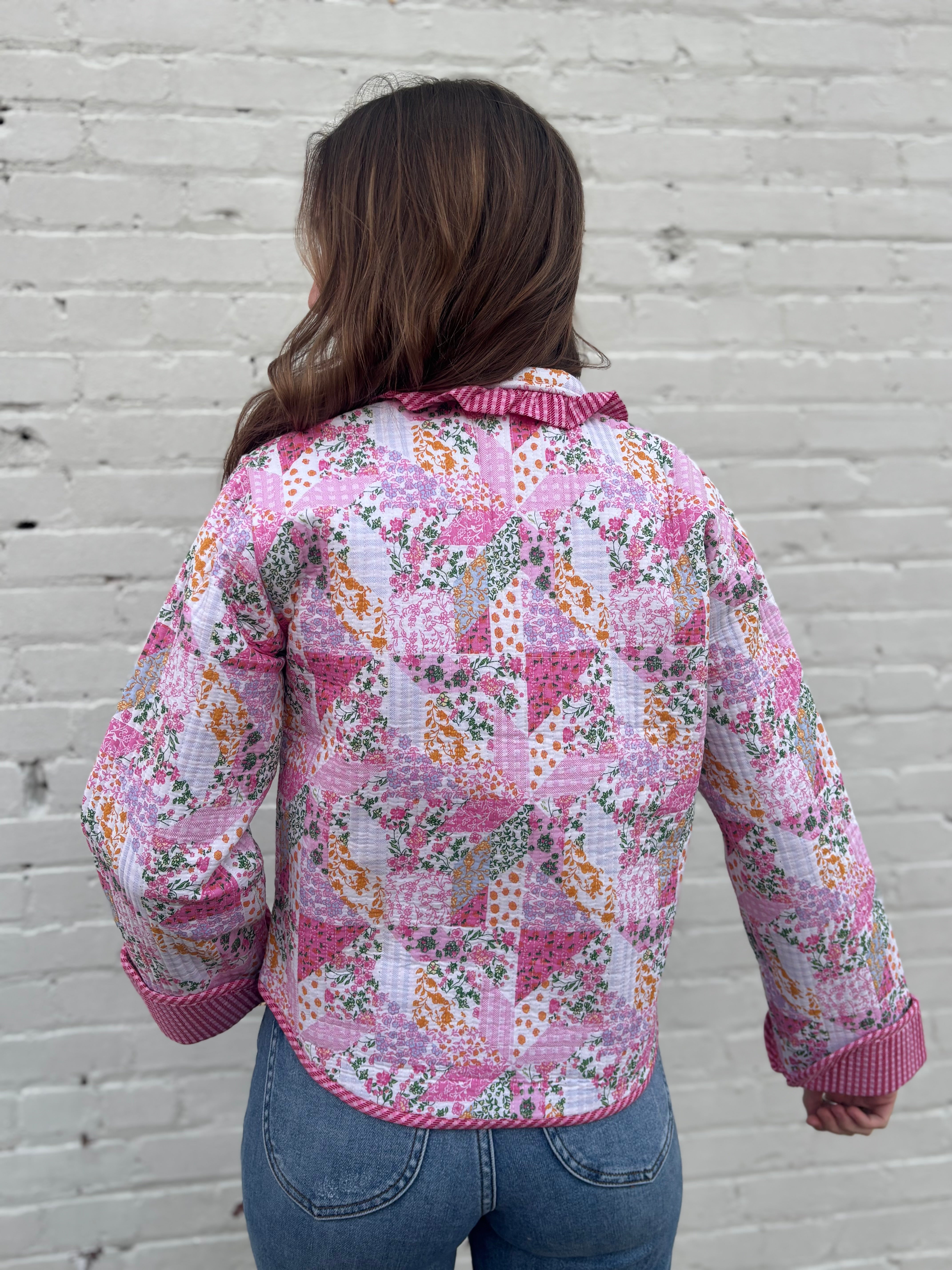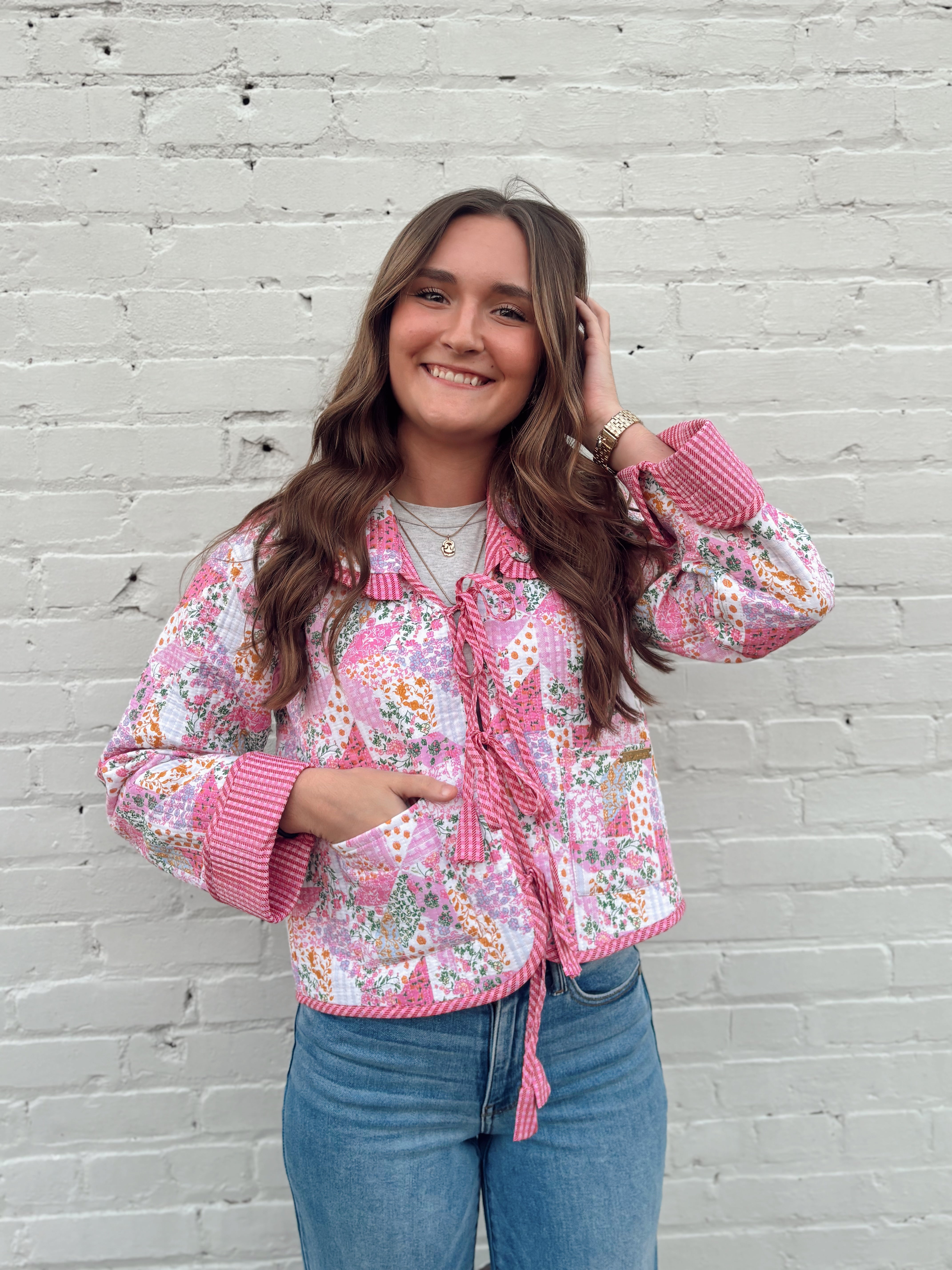 Add a touch of vintage charm to your cozy layers with The Ophelia Jacket. This quilted beauty features a feminine ruffle collar, tie-front closure, and sweet patch pockets for a timeless cottagecore vibe. The soft floral patchwork design is accented with contrasting gingham trim and a fully lined interior for extra comfort. Finished with the Simply Southern logo label, this jacket makes the perfect lightweight layer for fall mornings or festive holiday lounging.