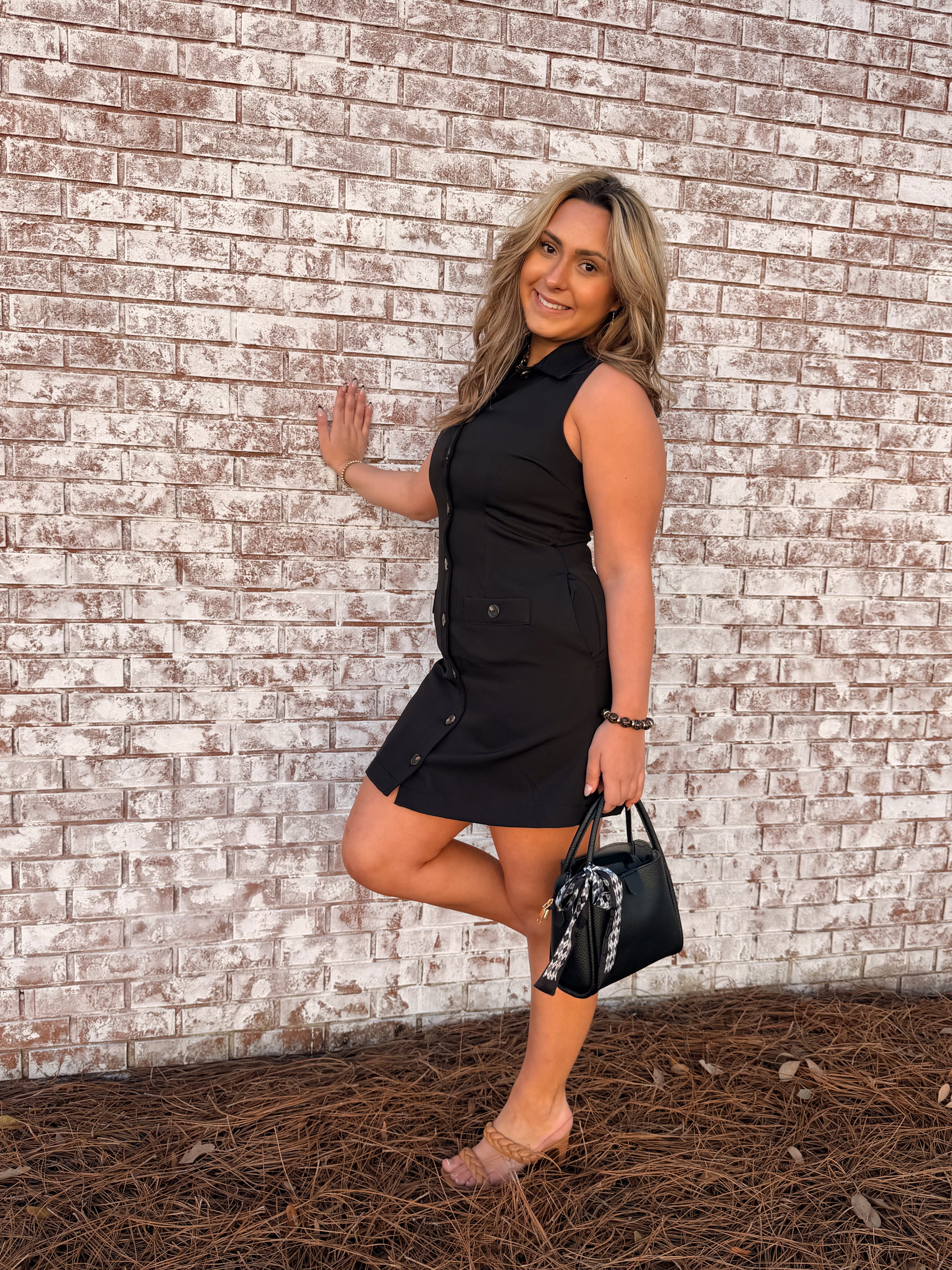 Classic, clean, and endlessly versatile — the Effortlessly Chic Button Front Dress is a must-have closet staple. This solid black sleeveless dress features a flattering button-front closure with non-functional flap details for a polished touch. Designed with side pockets (yes, pockets!) and a lightweight woven fabric, it’s fully lined and non-sheer for confident, all-day wear.