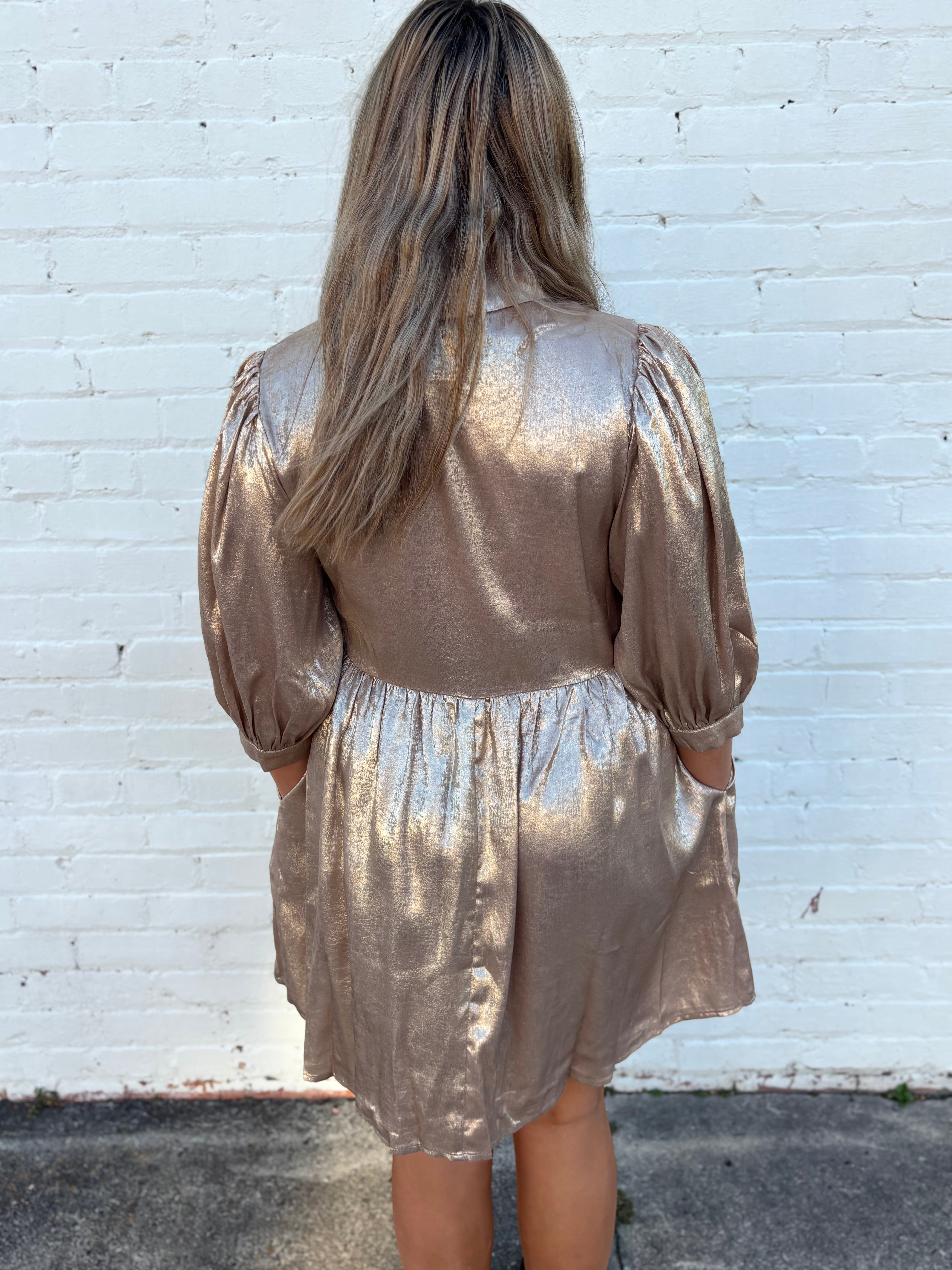 Steal the spotlight in our Golden Hour Metallic Babydoll Dress — the perfect mix of feminine charm and festive glam! This shimmering metallic dress features a collared neckline with dainty bow tie details, three-quarter peasant sleeves with band cuffs, and a flowy babydoll silhouette that flatters every figure.