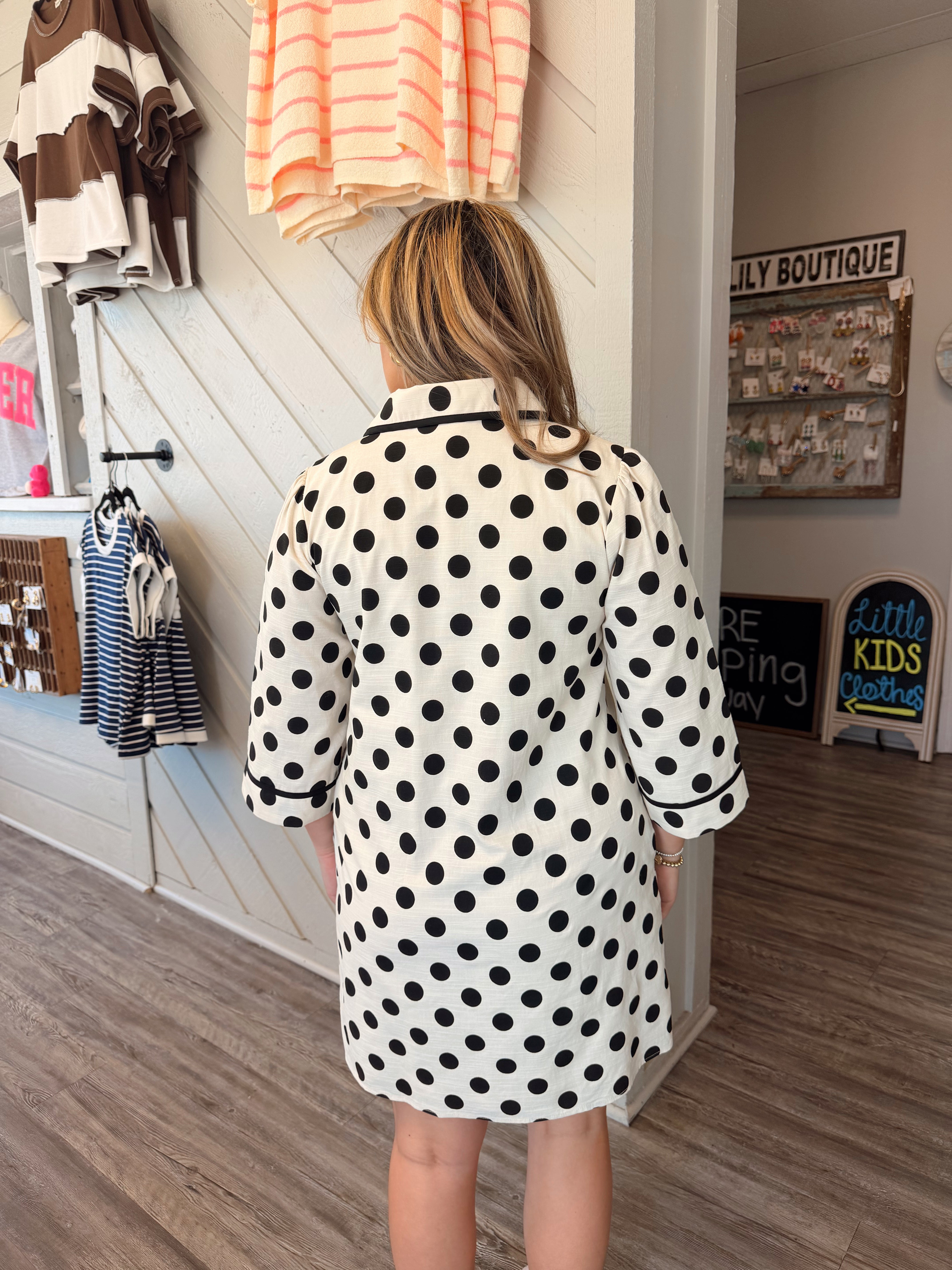Timeless, chic, and effortlessly polished — the Classic Charm Polka Dot Shift Dress is a must-have for workdays, weekends, and everything in between. Featuring a classic black polka dot print on a soft ivory background, this easy shift silhouette flatters without clinging. The split neckline with contrast trim adds a tailored touch, while the 3/4 sleeves with cuff detail keep it versatile for year-round wear.
