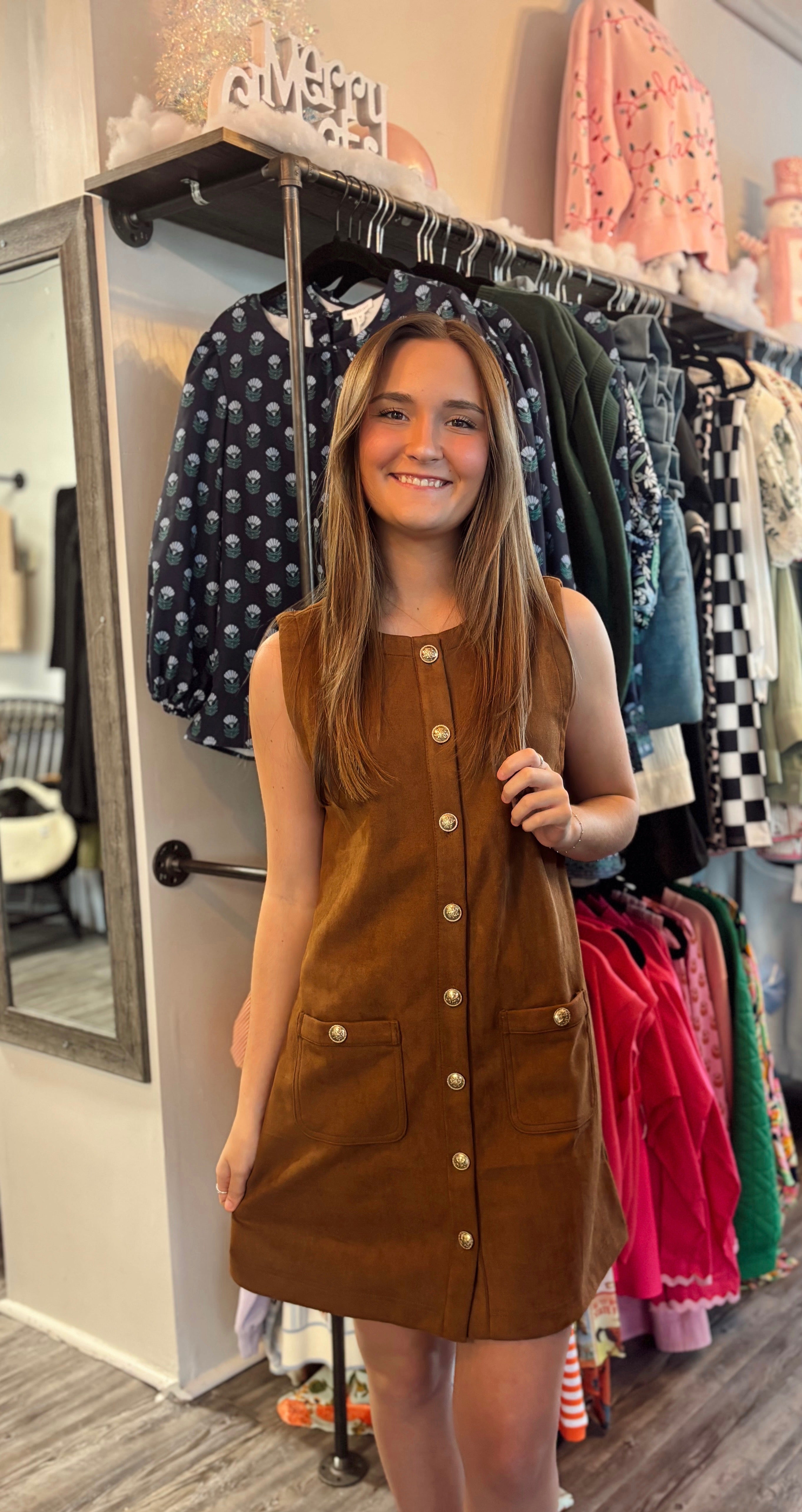 Channel effortless fall style with this timeless sleeveless suede shift dress. Designed with a flattering straight silhouette, gold button details, and front patch pockets, it’s the perfect mix of retro and refined. The soft faux suede fabric brings a cozy yet elevated feel, ideal for layering over blouses or turtlenecks. Pair it with tall boots for a classic fall look that’s ready for pumpkin patches, brunch dates, or downtown strolls.