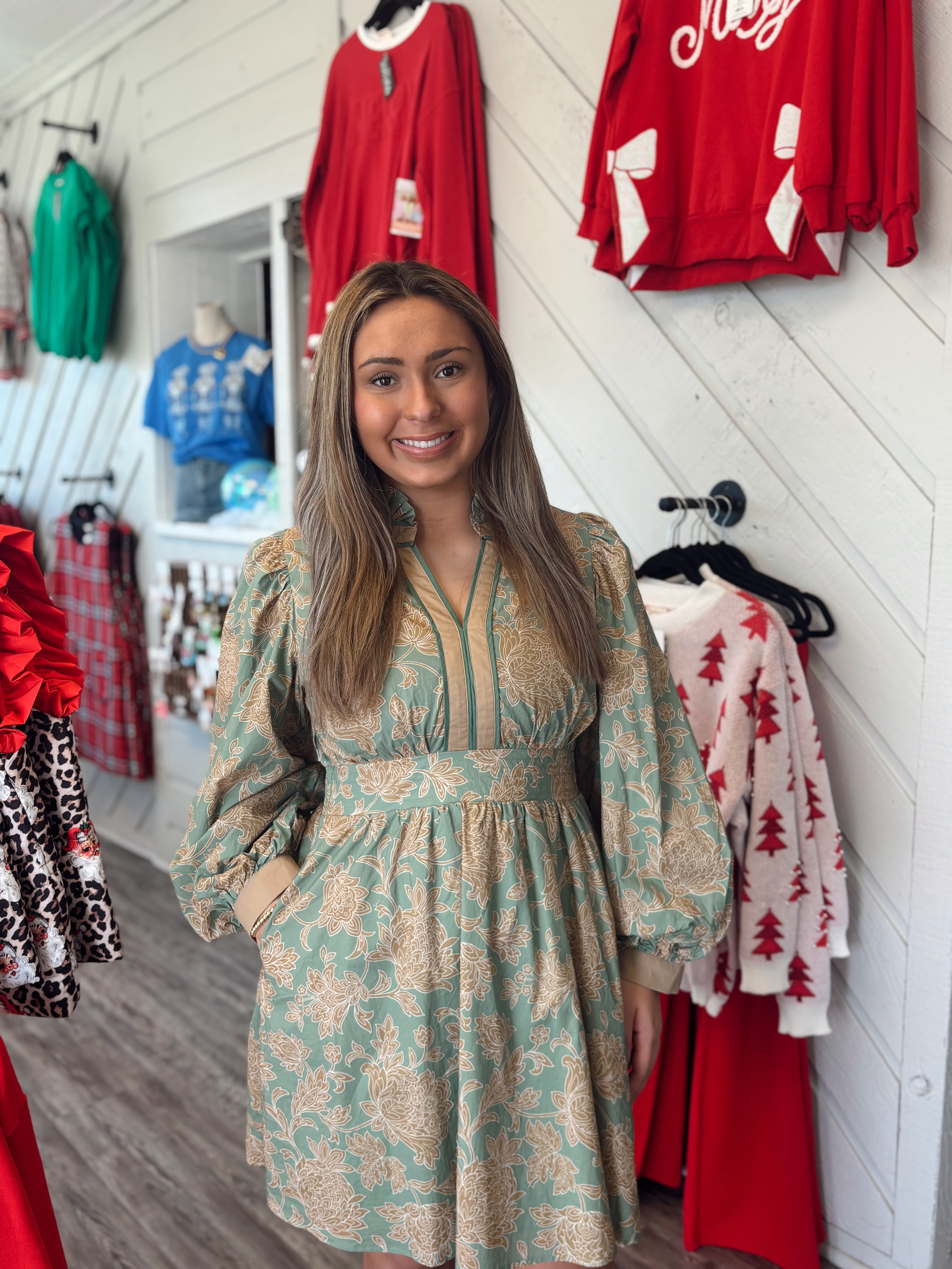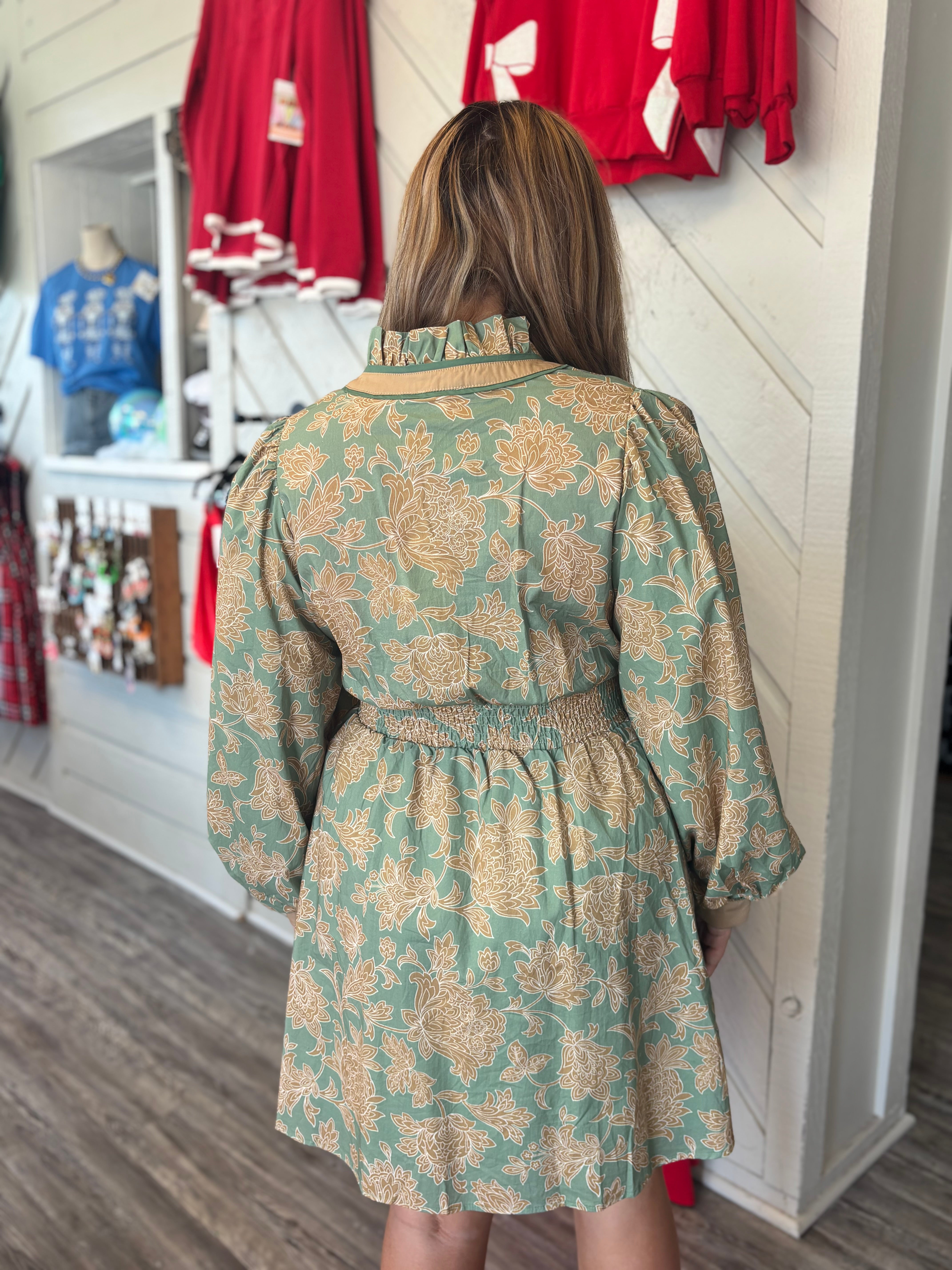 Turn heads in this stunning floral mini dress, blooming with vintage-inspired charm. Featuring long balloon sleeves and a ruffled neckline, this piece adds a touch of romance to your wardrobe. The flattering smocked back cinches the waist for a comfortable yet defined fit, while the solid contrast trim highlights the neckline and waist for a tailored finish. Perfect for garden parties, brunch dates, or fall festivities — pair with strappy heels or boots for a timeless look.