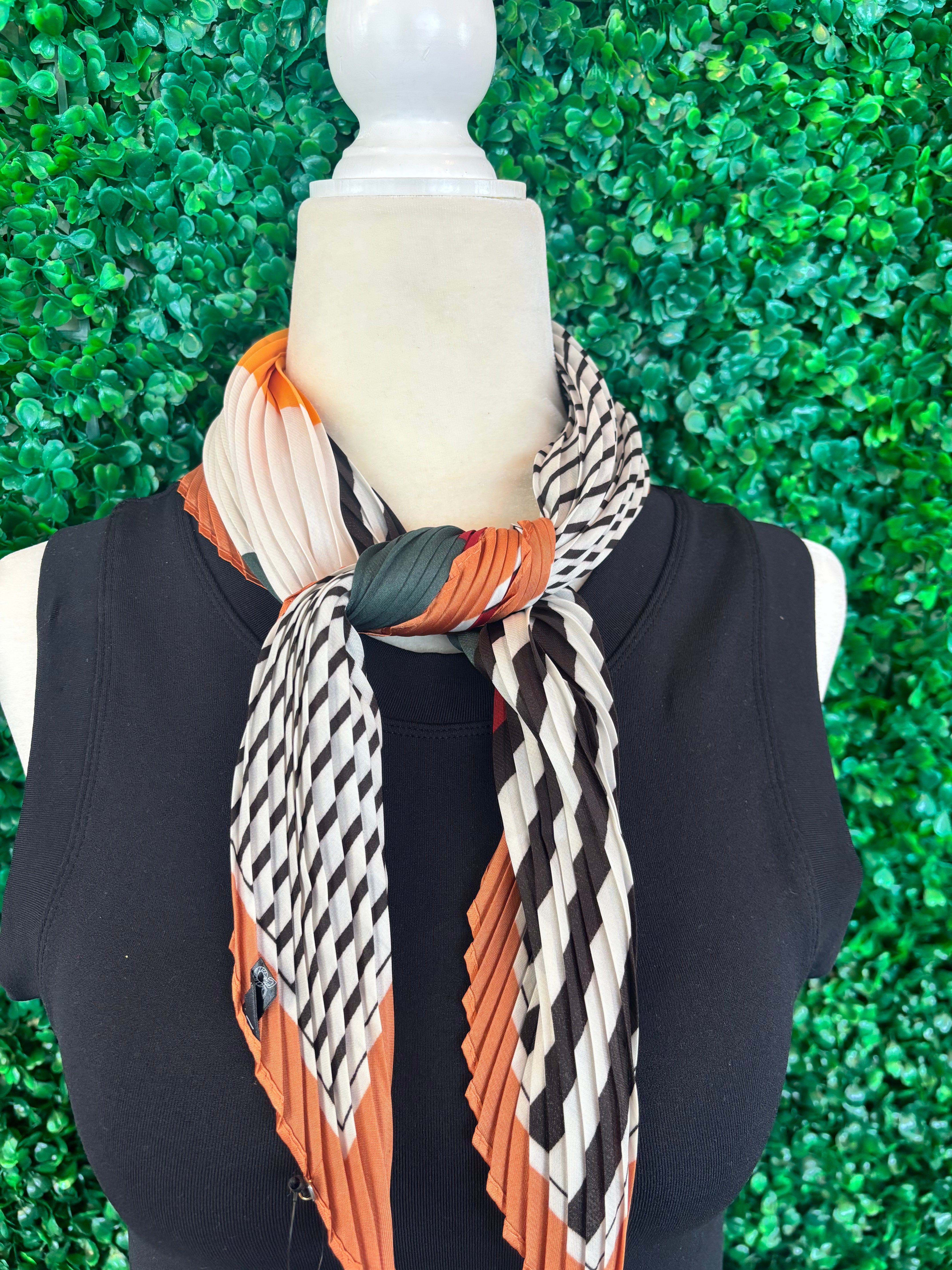 Step into the season with our Autumn Stroll Pleated Scarf — the perfect blend of classic pattern and cozy charm. Featuring bold geometric stripes in shades of rust, cream, black, and deep green, this lightweight pleated scarf adds effortless sophistication to any outfit. Its silky texture and warm autumn tones make it ideal for layering through the cooler months while keeping your look chic and polished.