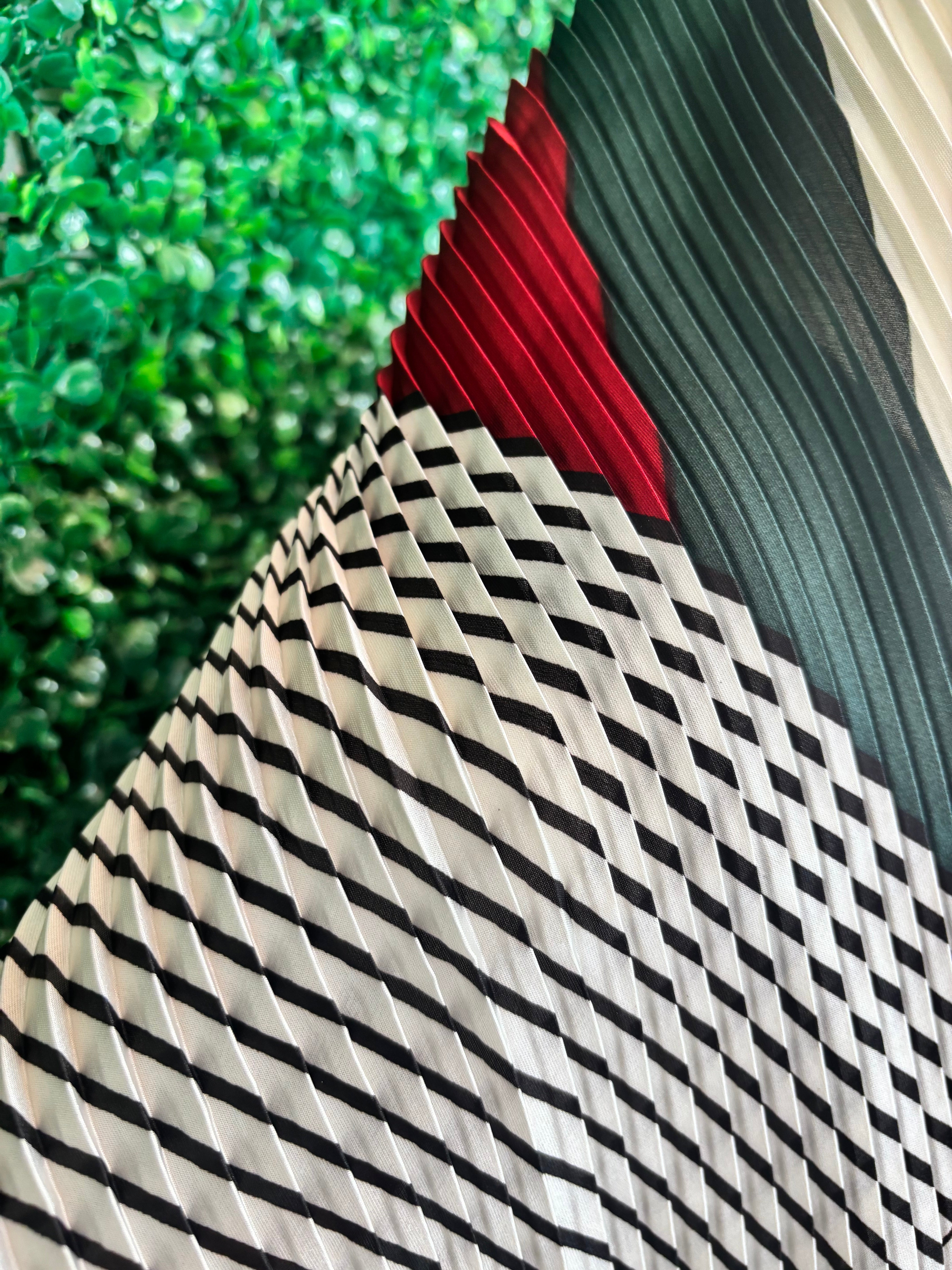 - Soft pleated fabric with multicolor geometric pattern