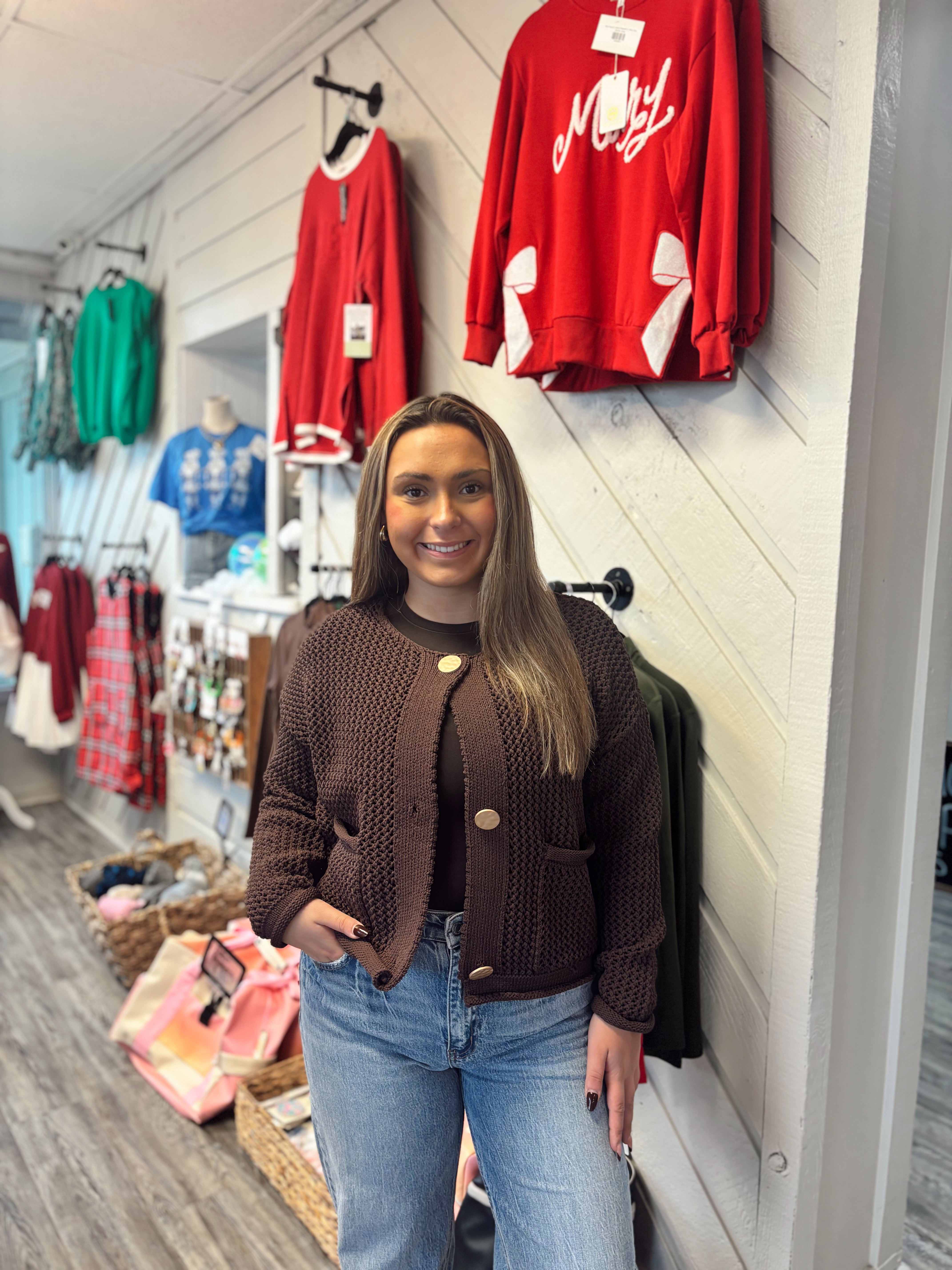 Cozy meets chic in this open-weave knit cardigan, now available in a warm chestnut brown. Crafted with a lightly sheer, breathable texture, it’s the perfect layer for effortless everyday style. The oversized gold accent buttons elevate the look with a touch of shine, while the functional front pockets add practical charm. Lightweight and easy to throw on year-round, this cardigan brings timeless softness to any outfit.