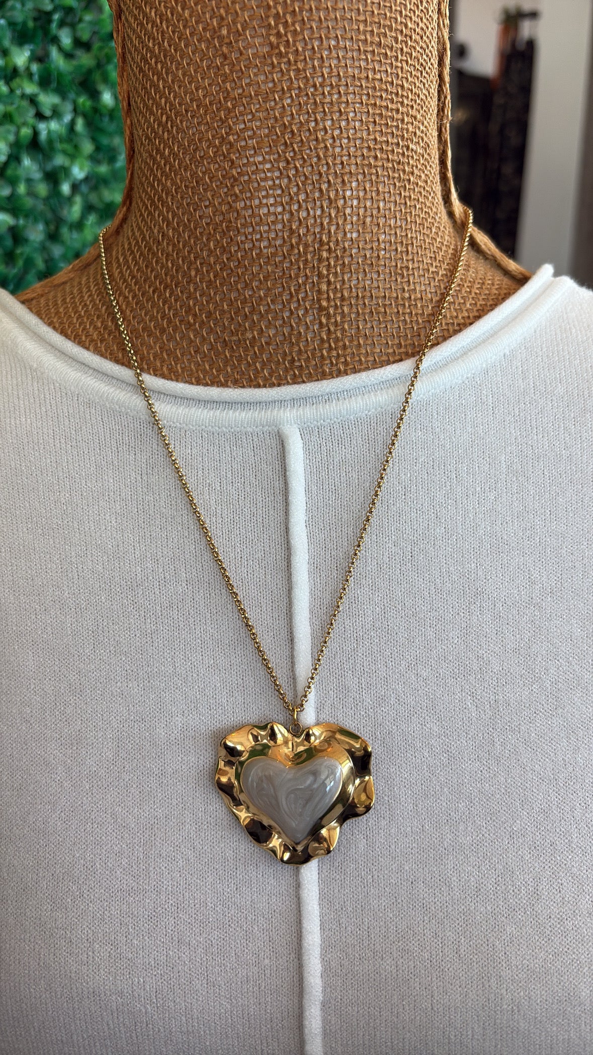 Soft, classic, and full of charm, our Golden Heart Pendant Necklace is a timeless piece you’ll treasure. Featuring a pearl-tone heart center framed by a textured gold border, this necklace adds a romantic touch to any outfit.