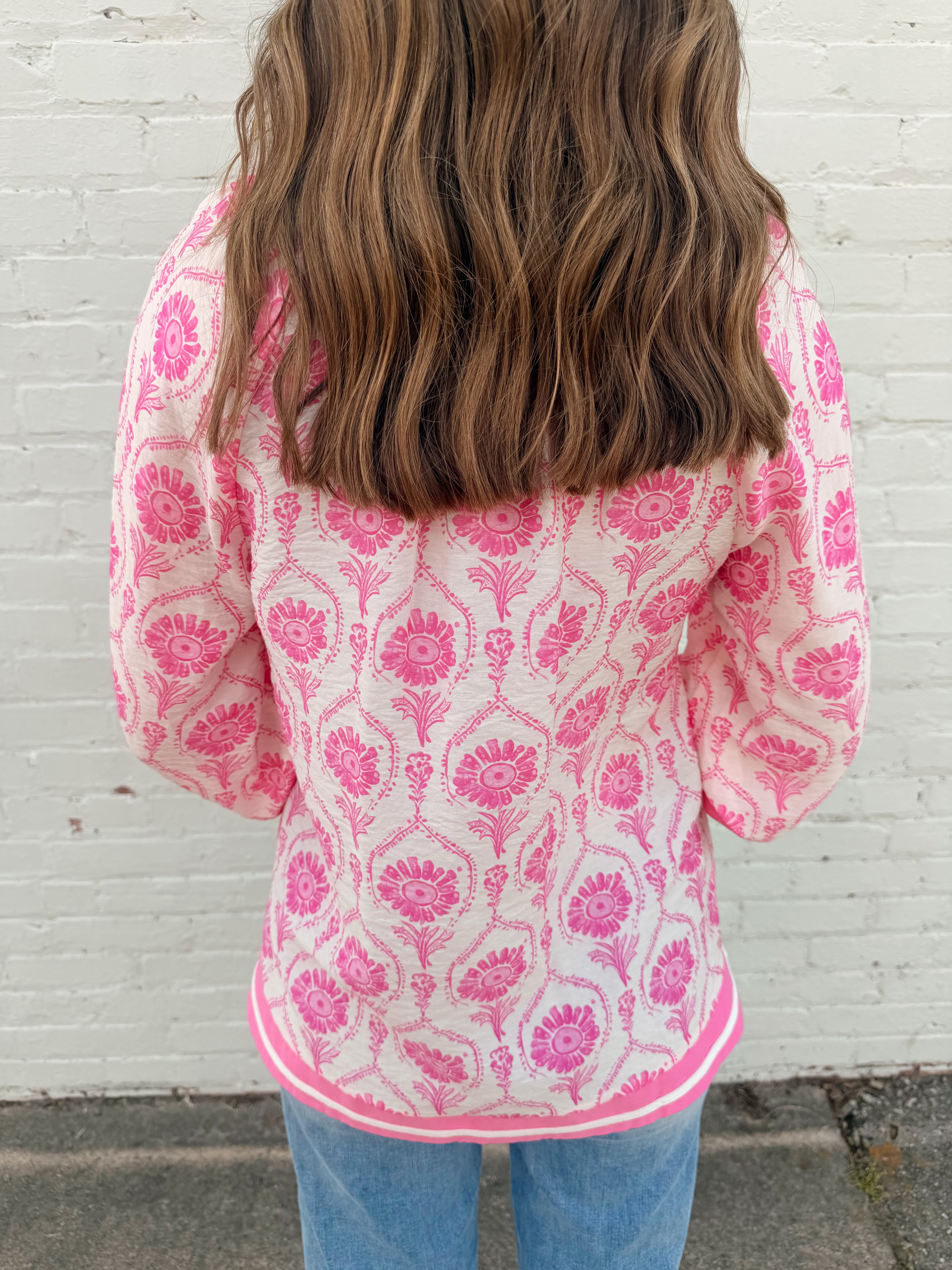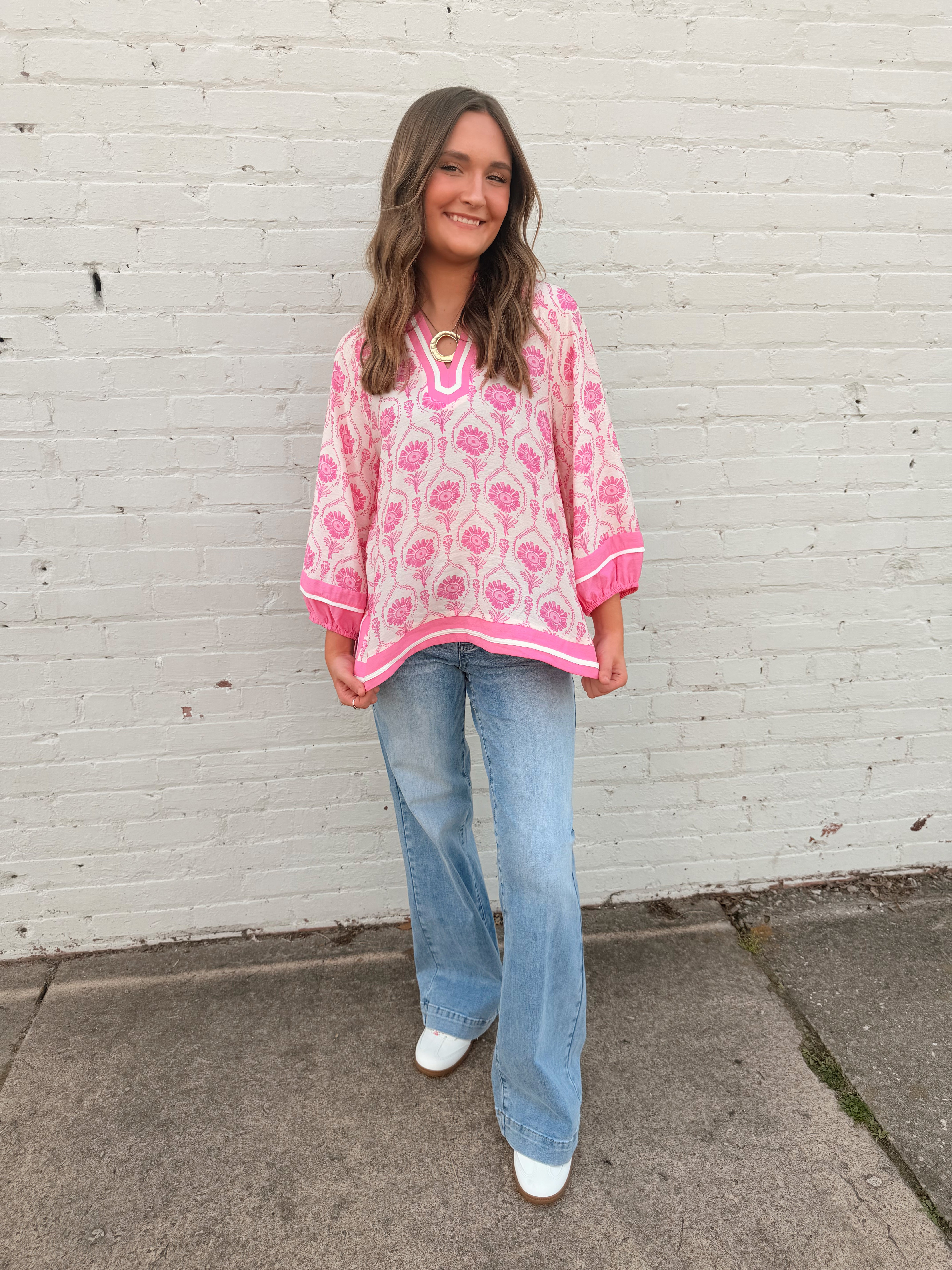 Add a splash of color and charm to your wardrobe with this vibrant pink floral tunic. Featuring a beautiful, intricate print and a relaxed, flowy fit, this top is perfect for warm-weather days. The split neckline with contrast trim adds a chic touch, while the three-quarter length sleeves with elastic cuffs provide a comfortable and stylish finish. Pair it with your favorite jeans or white pants for an effortlessly polished look.