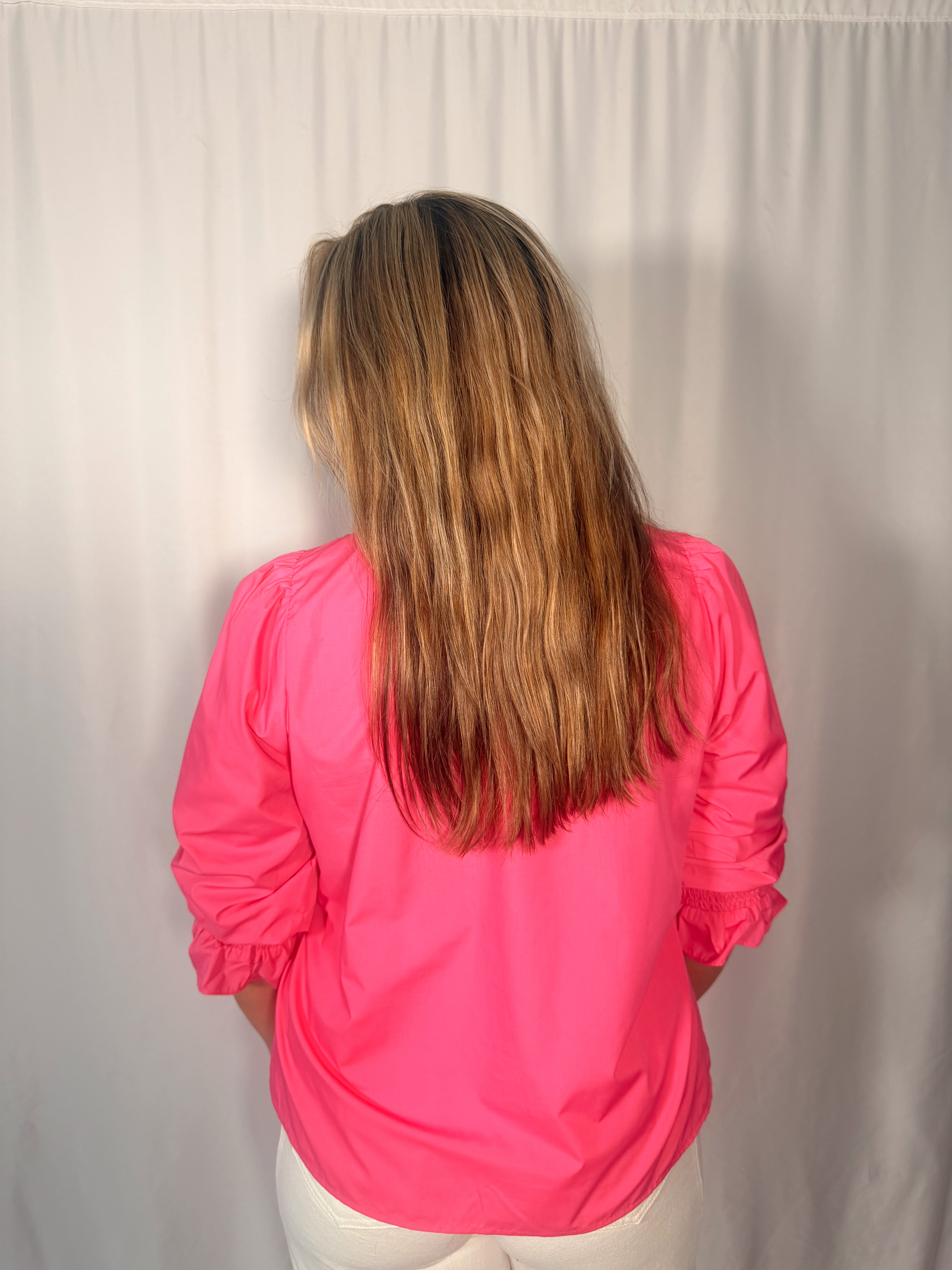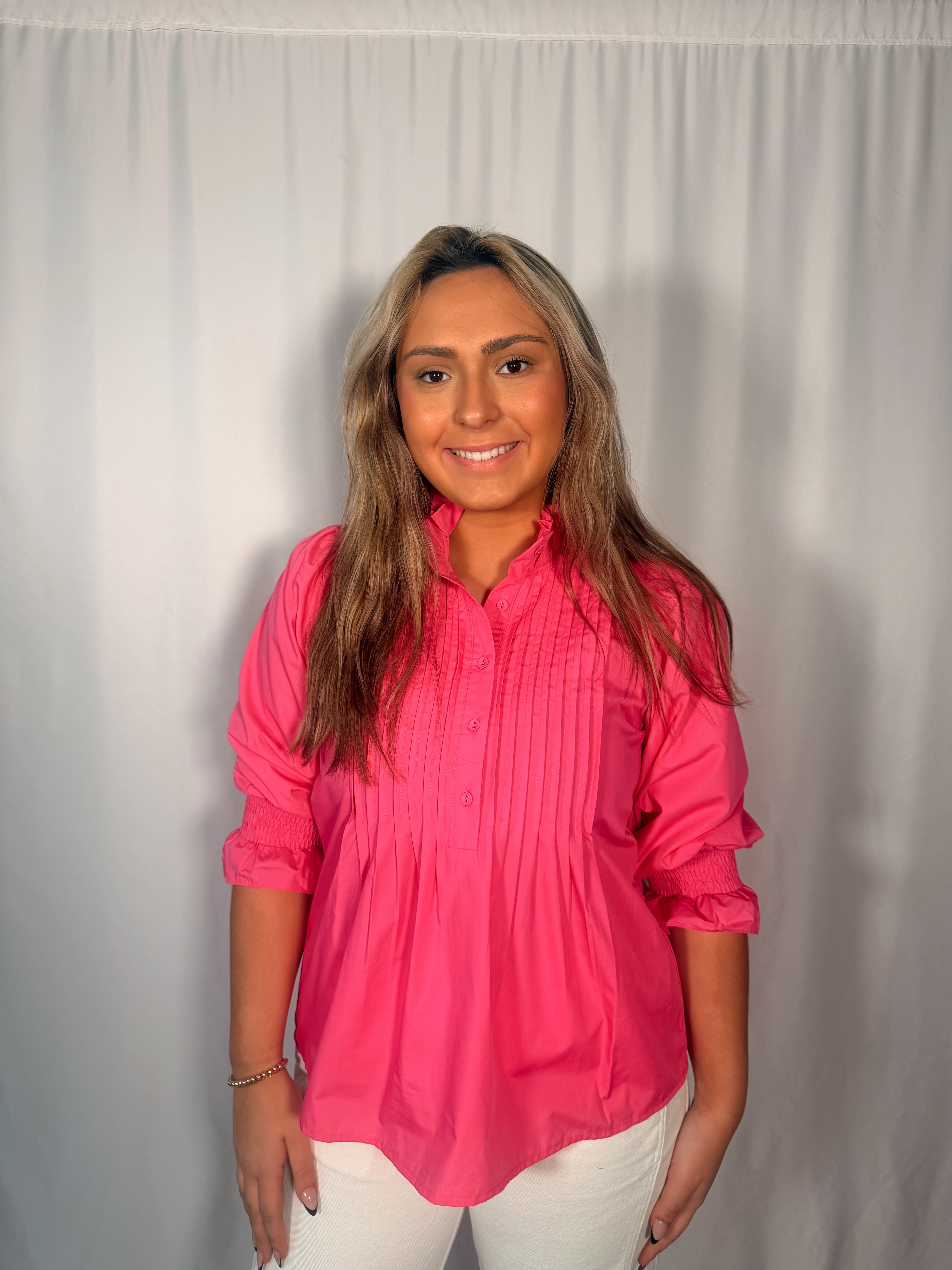 Feminine and eye-catching, the Rosé Ruffle Pleated Blouse brings effortless charm to any outfit. Designed with a delicate pleated front panel and a ruffled mock neckline, this woven top features a button-front closure for a timeless touch. The 3/4 sleeves are finished with elasticated cuffs for soft structure and comfortable wear. Lightweight and non-sheer, this blouse is perfect for dressing up denim, white pants, or tailored trousers for work or weekend plans.