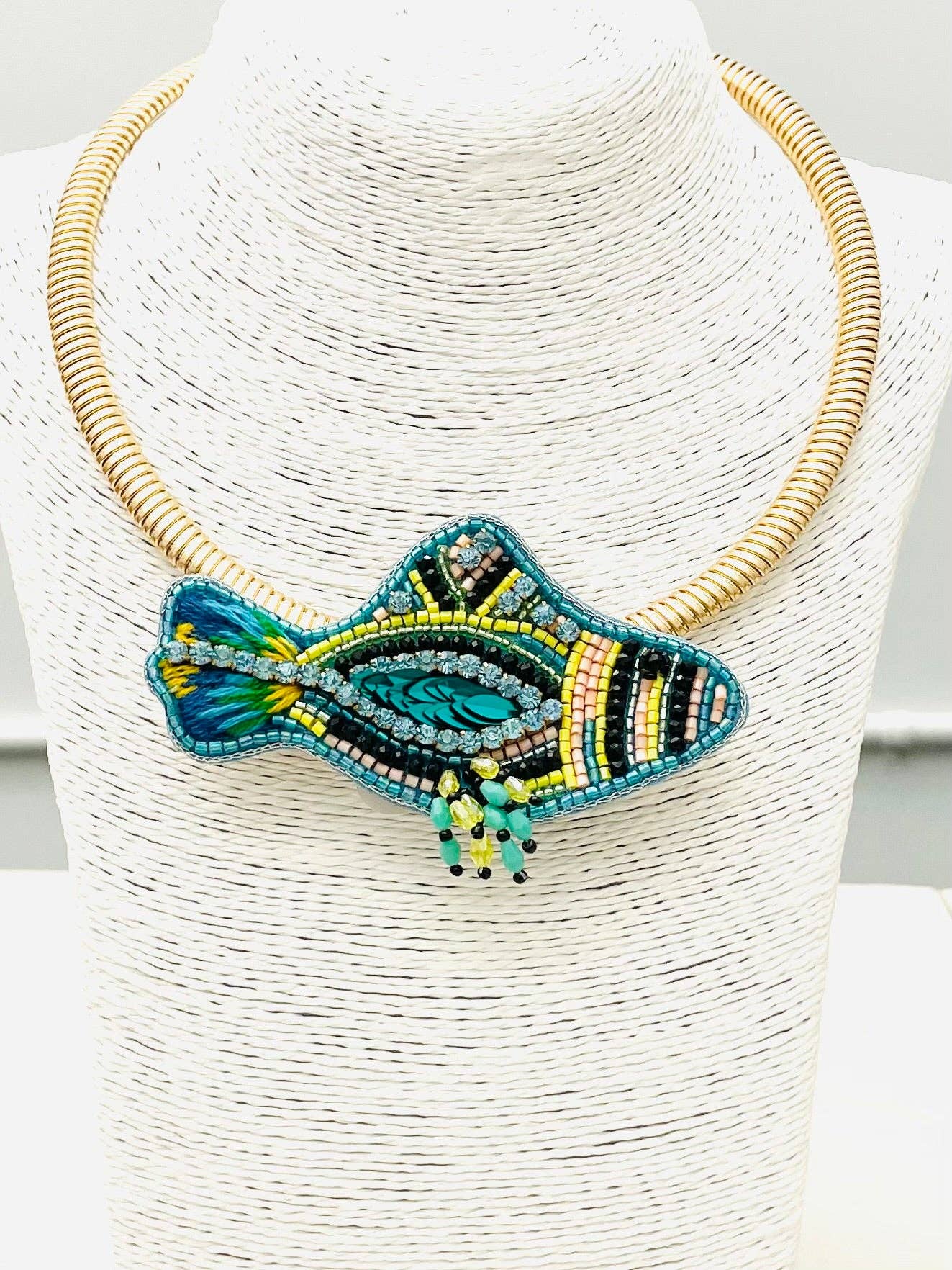 Add a playful coastal touch to your look with this beaded fish statement necklace. Featuring intricate hand-beaded detailing in vibrant blue and green tones, this eye-catching pendant sits on a sleek brass collar for a bold yet effortless style. Perfect for vacation outfits, summer events, or adding a fun beachy vibe to everyday looks.