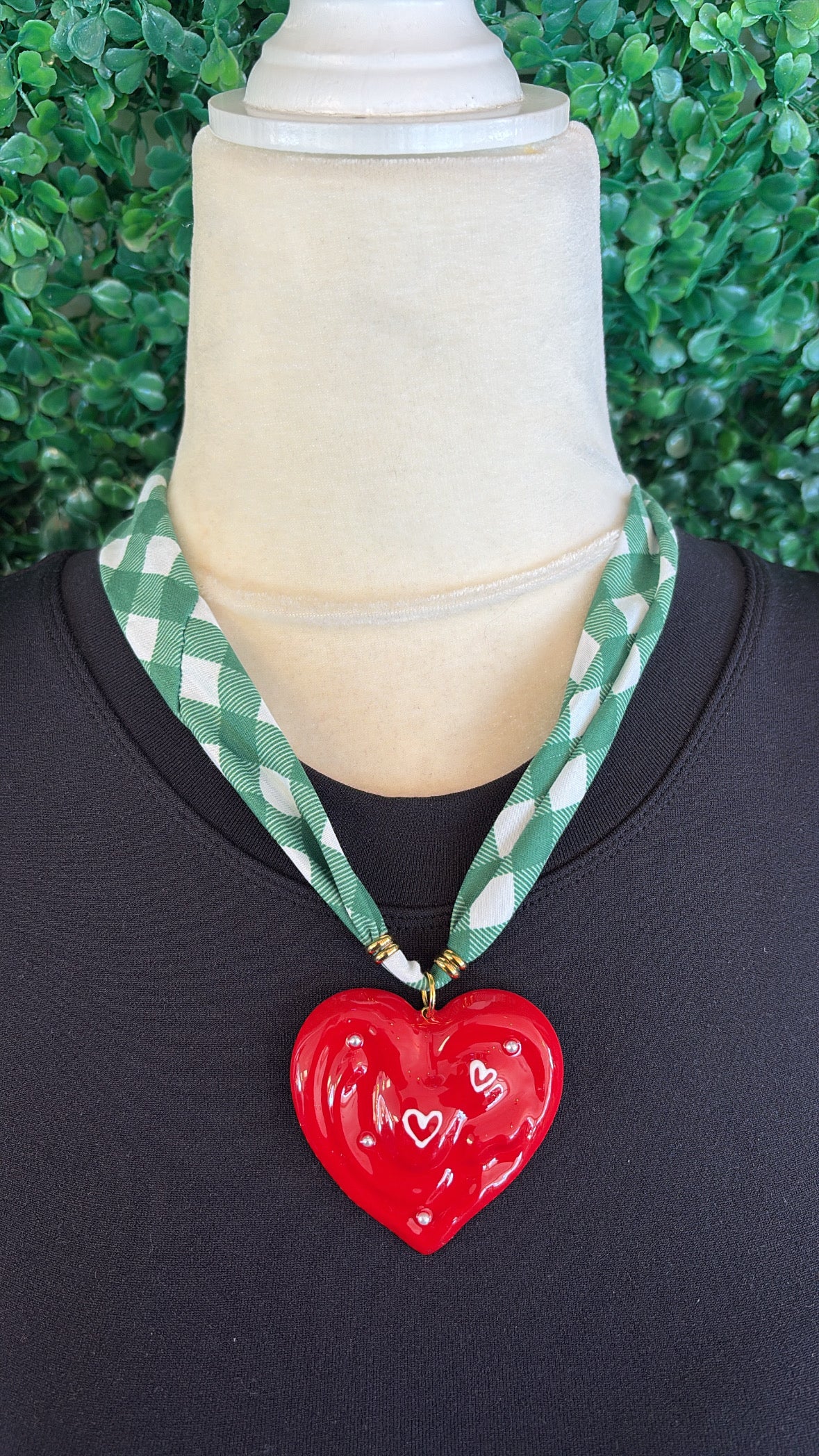 It’s true — your heart just grew three sizes with this festive statement piece! 💓 Featuring a bold red heart pendant (complete with tiny white hearts) on a green-and-white patterned scarf chain, this playful necklace brings all the Whoville vibes. Perfect for adding a pop of Christmas cheer to your outfit — whether you’re feeling merry or just a little bit Grinchy.