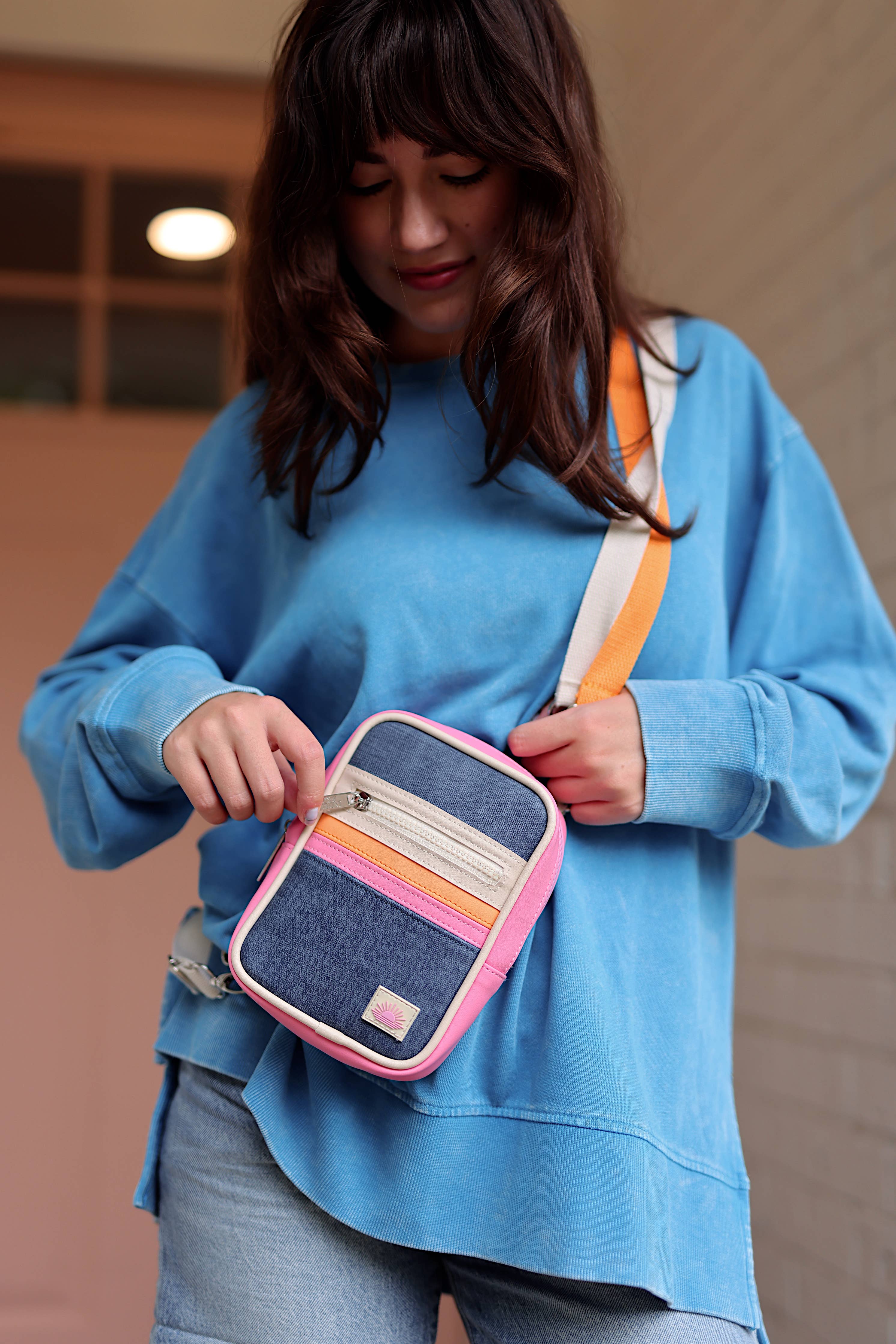 Add a pop of color and practicality to your look with this stylish denim print crossbody purse. Featuring a playful mix of denim, cream, and pink PU vegan leather with a bold orange-accent strap, this bag is as functional as it is fashionable.