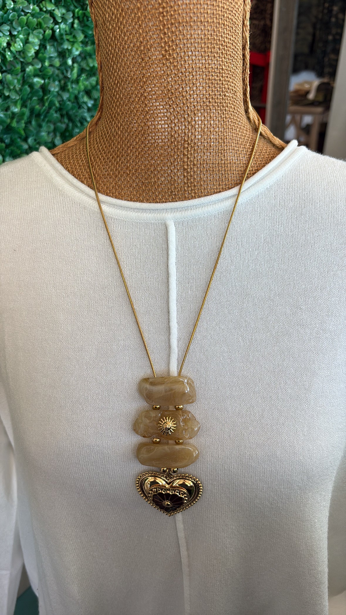 Elegant with a touch of romance, our Golden Bloom Heart Pendant Necklace features soft neutral-toned stone beads accented with a delicate gold floral detail, finished with a charming gold heart pendant. The layered elements create depth and interest while keeping the look timeless and wearable.
