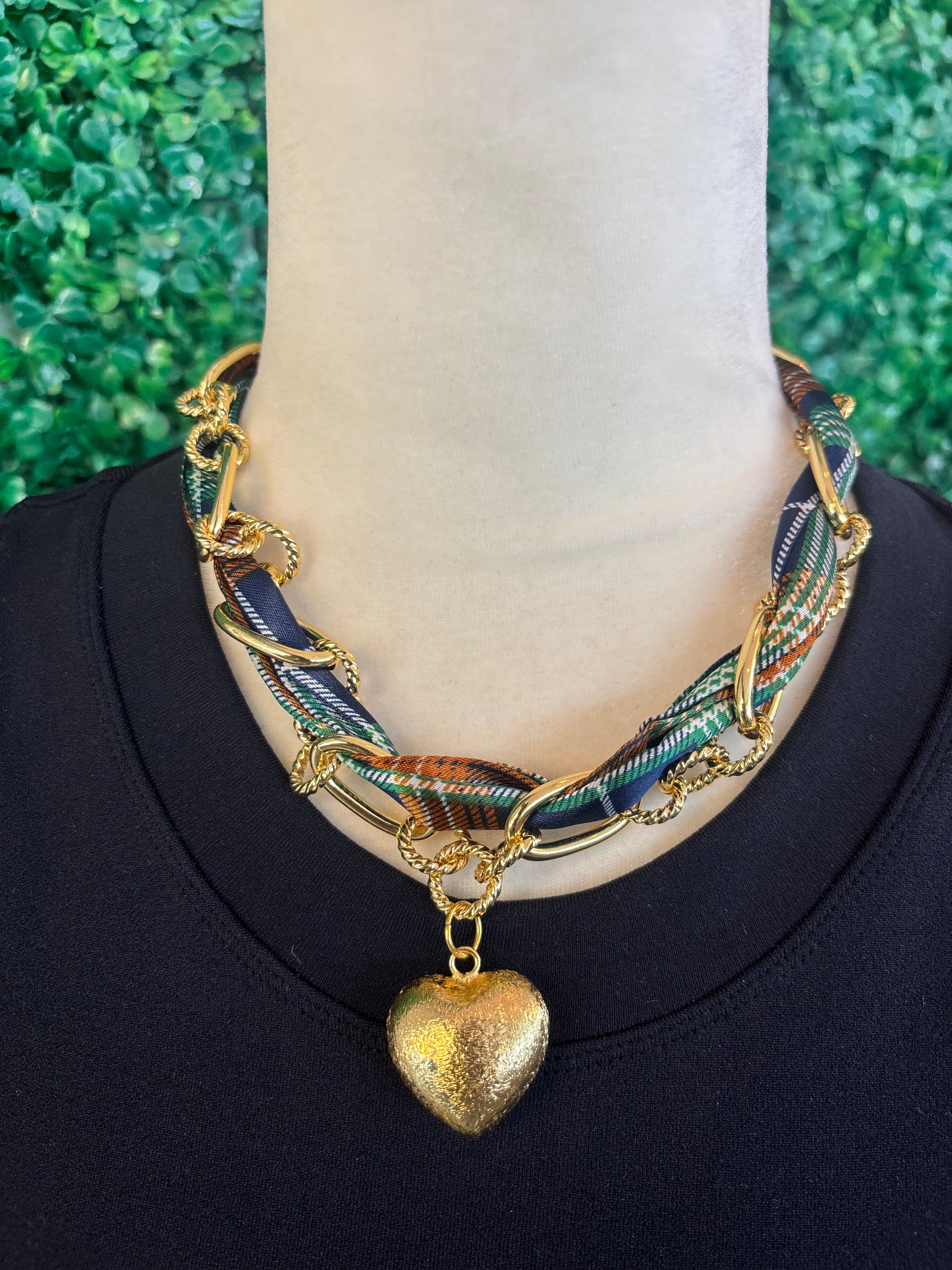 Fall in love with the chic charm of our Golden Heart Scarf Necklace — where cozy meets classy. This elegant piece features a silky plaid-patterned scarf in deep autumn tones intertwined with luxe gold chain links, all centered around a textured gold heart pendant that makes a statement without saying a word. Perfect for dressing up sweaters, blouses, or even simple tees, this necklace adds warmth and sophistication to any look.