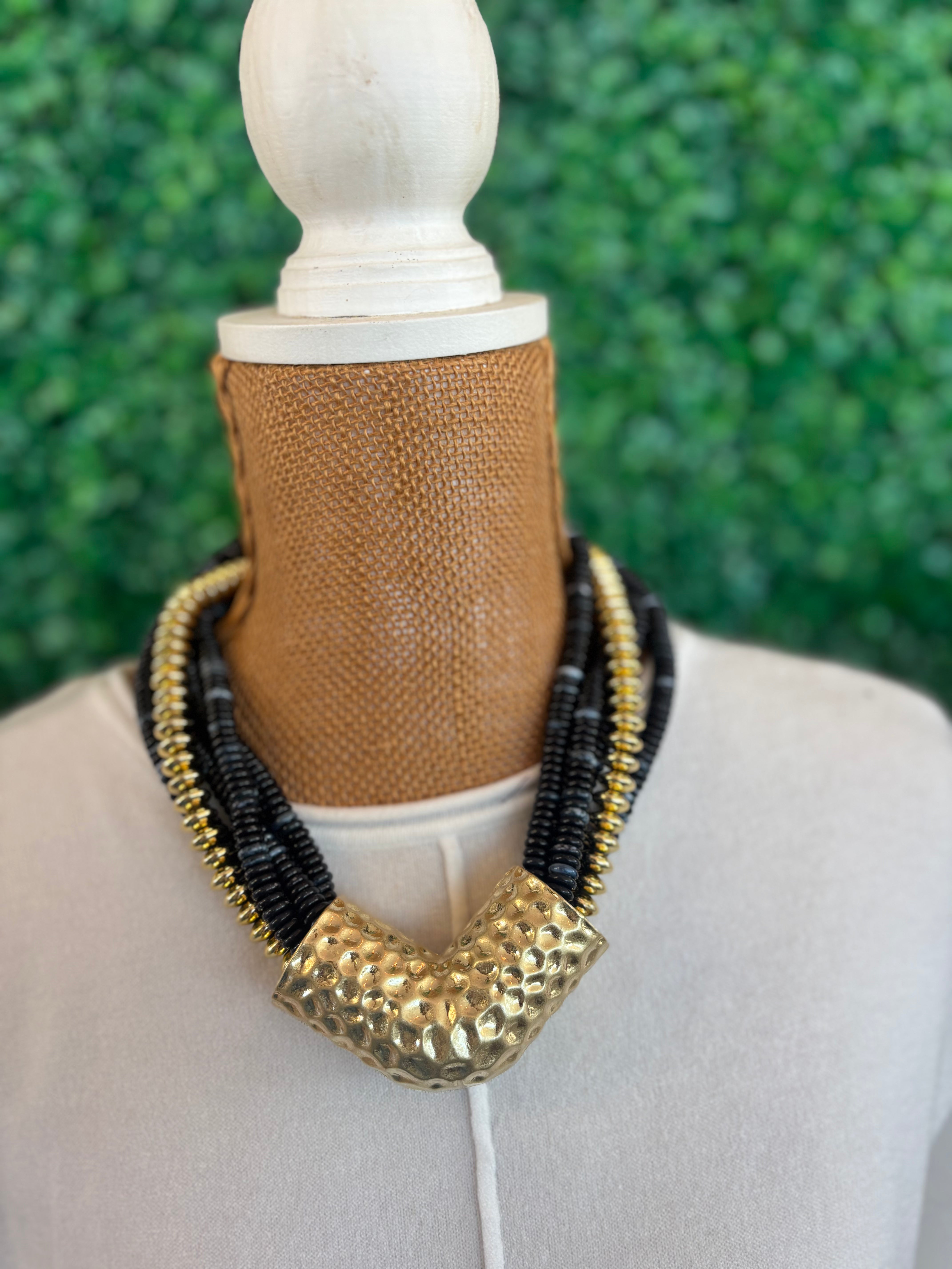 Bold and striking with a touch of edge, the Midnight Gold Beaded Statement Necklace features layered black beads accented with gold detailing and finished with a textured hammered gold focal piece. This necklace instantly elevates even the simplest outfit.
