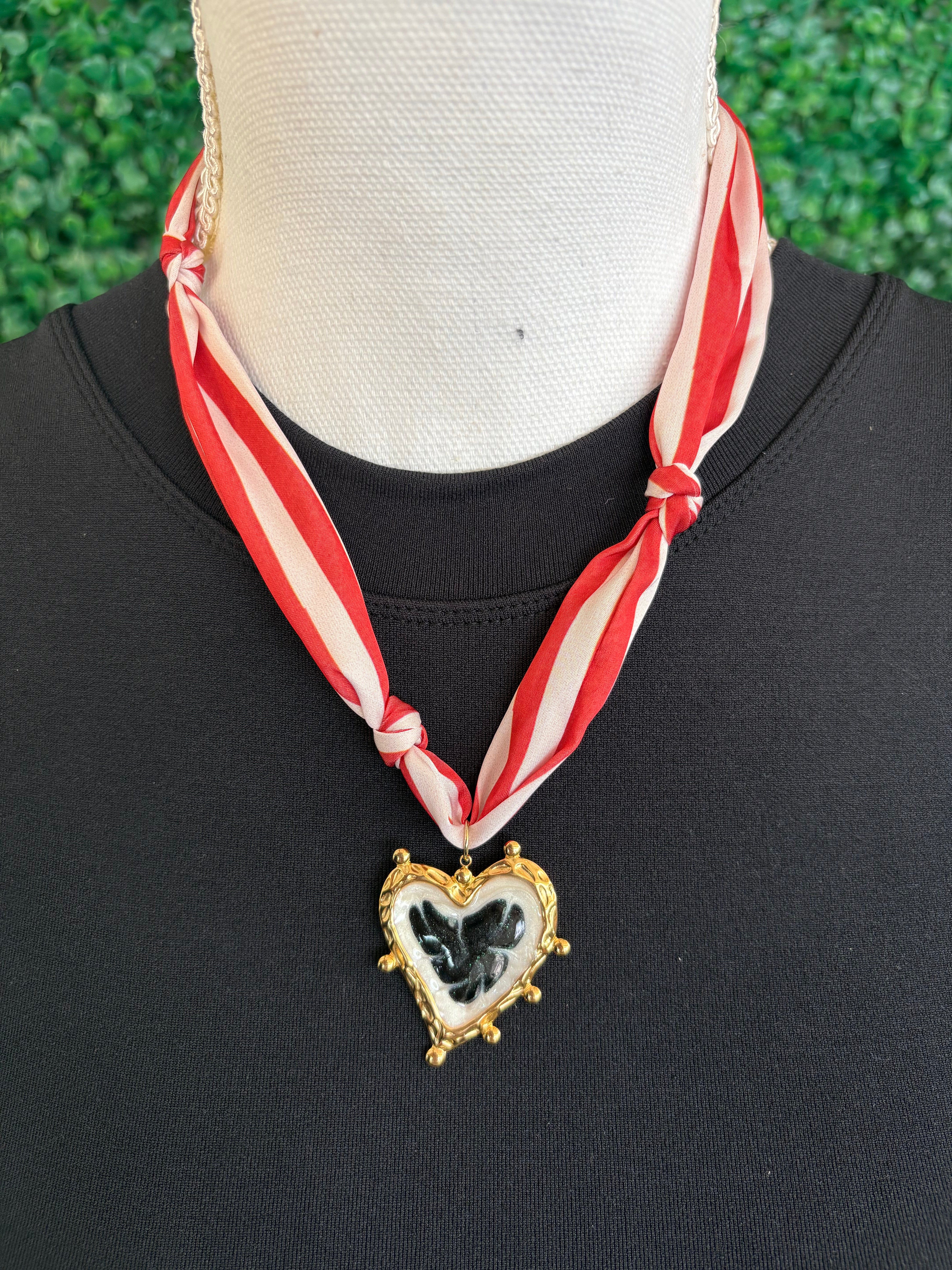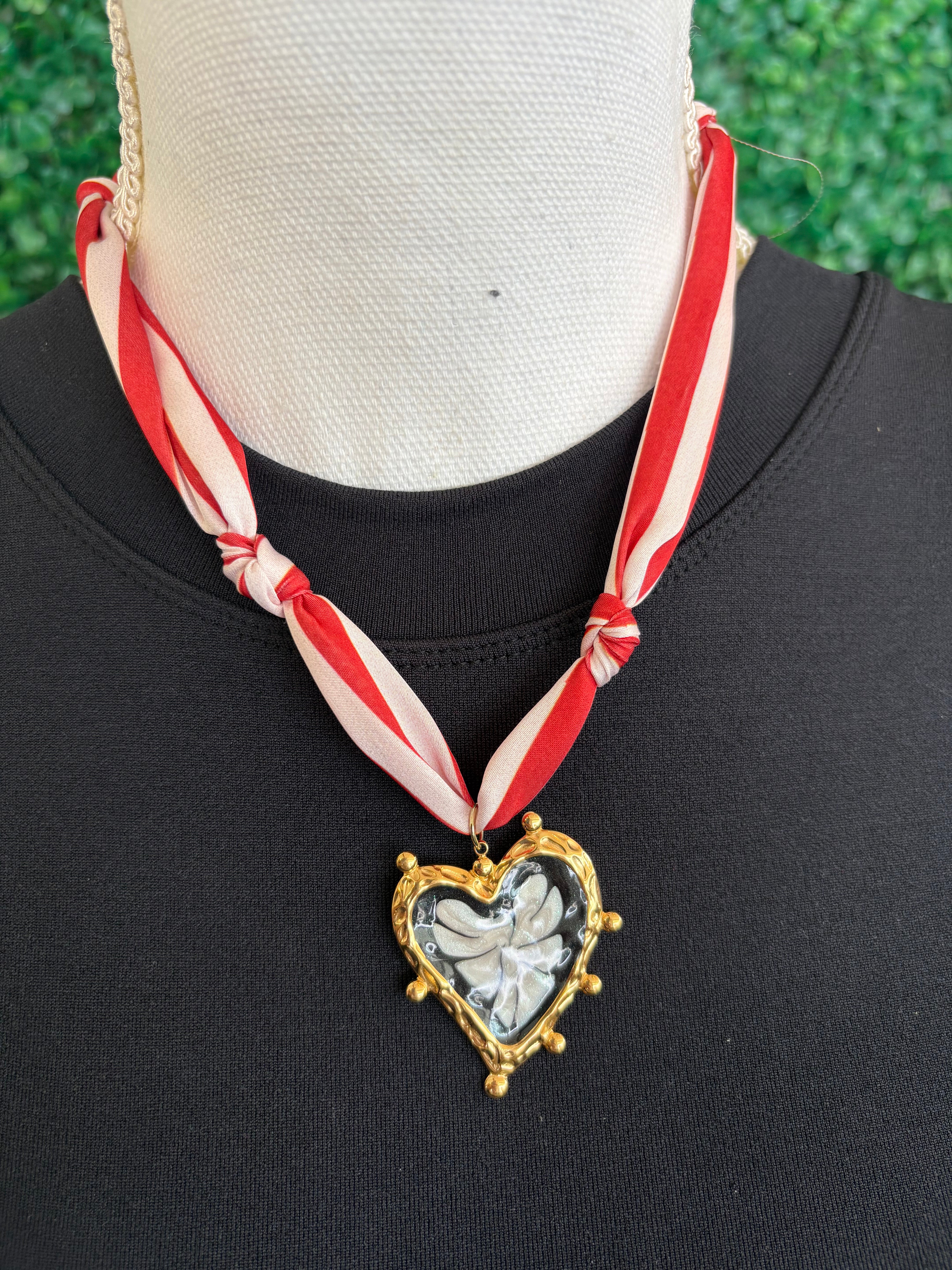 Show off your bold boutique style with our Striped Scarf Necklace with Gold Heart Pendant – Angel & Dove Design ❤️✨. Featuring a vibrant red-and-white striped scarf chain and a textured gold heart pendant
