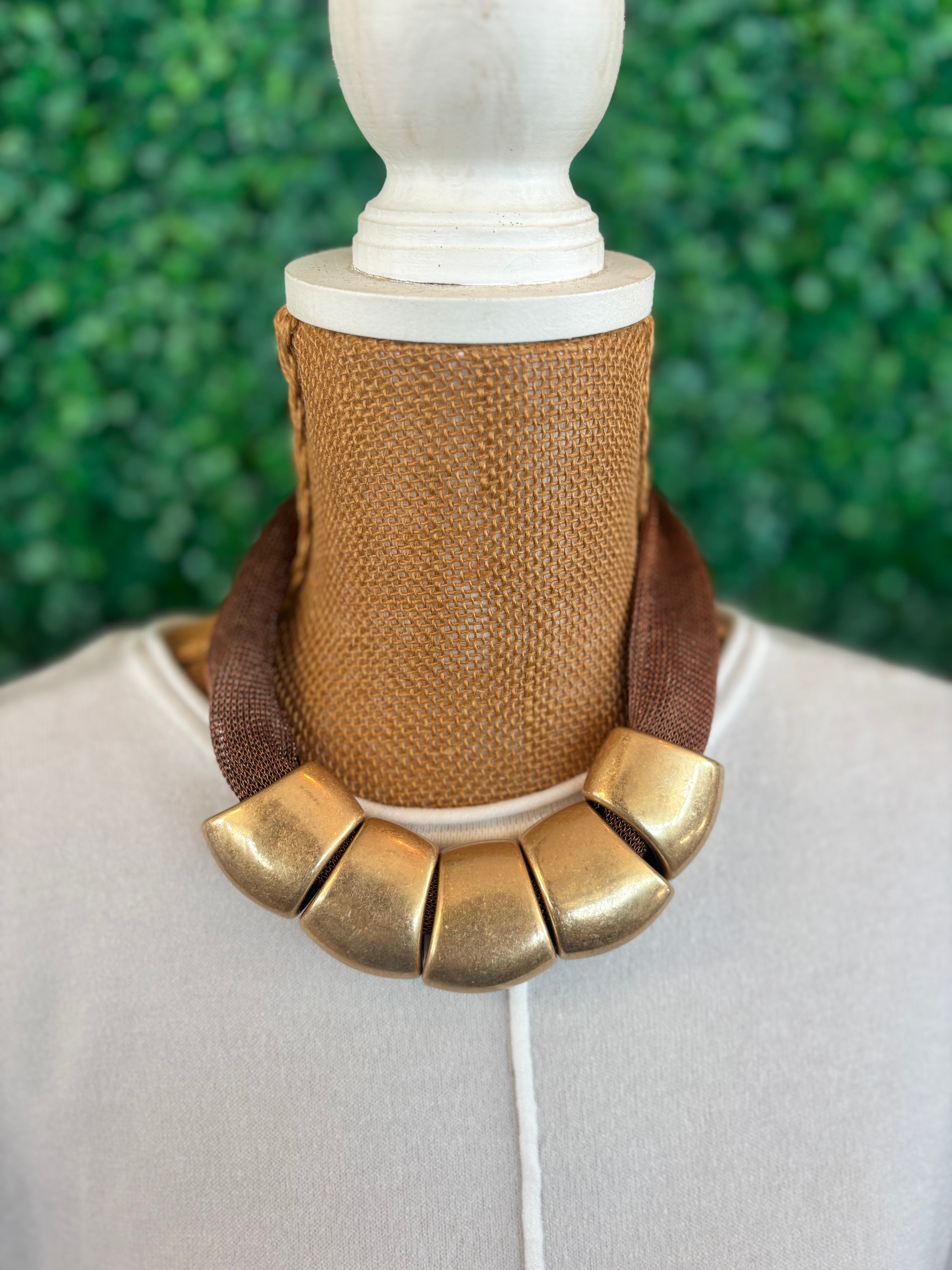 Rich, warm, and effortlessly chic, the Cocoa Luxe Statement Necklace brings depth and sophistication to your accessory collection. Designed with a deep brown mesh cord and bold brushed gold curved beads, this necklace is the perfect finishing touch for fall neutrals, cozy layers, and elevated everyday looks.