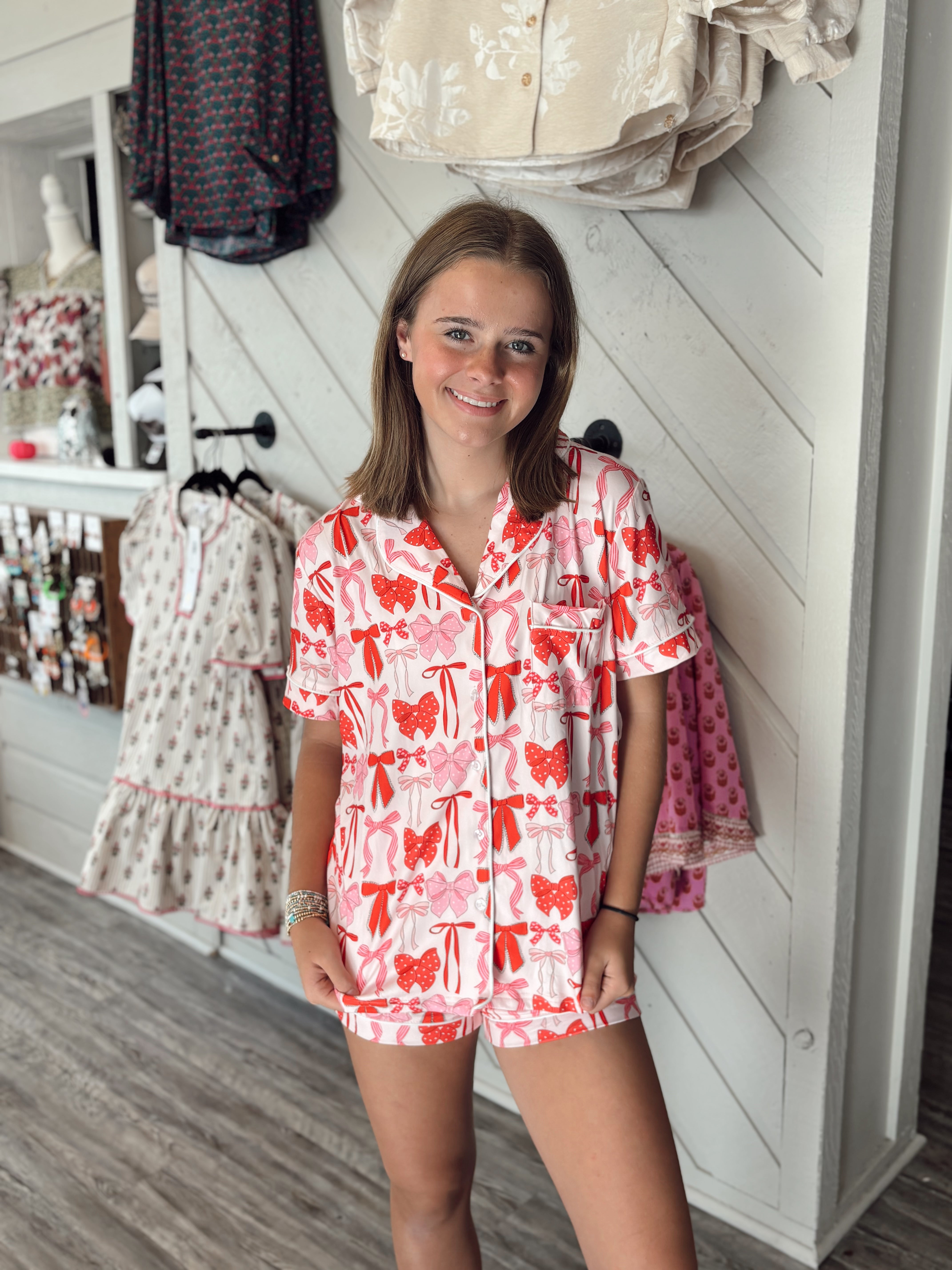 Calling all boutique buyers with a love for flirty fashion—this Pink & Red Coquette Pajama Shorts Set is your next viral-ready best-seller. Drenched in playful bows and made with cozy-soft materials, this women’s pajama set is the perfect mix of comfort and coquette aesthetic. The loose-fit top pairs effortlessly with the elastic-waist shorts, making it an easy favorite for pajama parties and casual lounging alike. Whether you’re curating a girly holiday drop or refreshing your lounge collection with trendy appeal, this pajama shorts set delivers on both looks and feel. Bows are still having their moment, and this set gives your customers an ultra-trendy way to wear the look. Two piece matching set 95% polyester, 5% spandex machine wash cold, dry flat true to size front pocket on shirt has pockets button closure elastic waistband