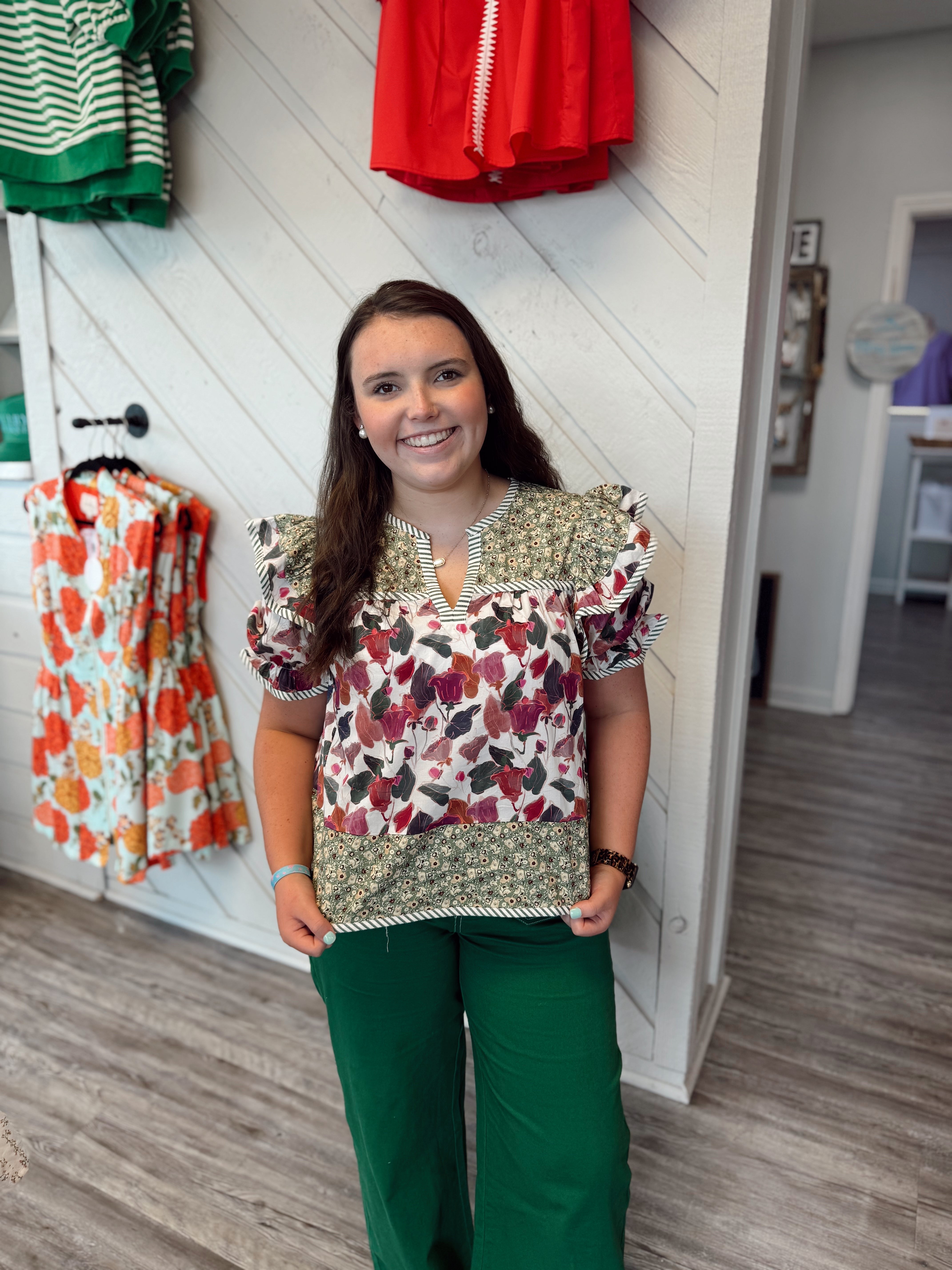 Add a playful pop to your wardrobe with the Tulip Whimsy Scallop Trim Top. This caftan-inspired blouse features a vibrant floral tulip pattern with short puff sleeves and a structured high neckline. The contrast scalloped trim adds the perfect feminine touch, while the cuff band sleeves keep the look polished. Made from a lightweight, woven fabric that’s breathable and non-sheer—perfect for warm-weather styling.