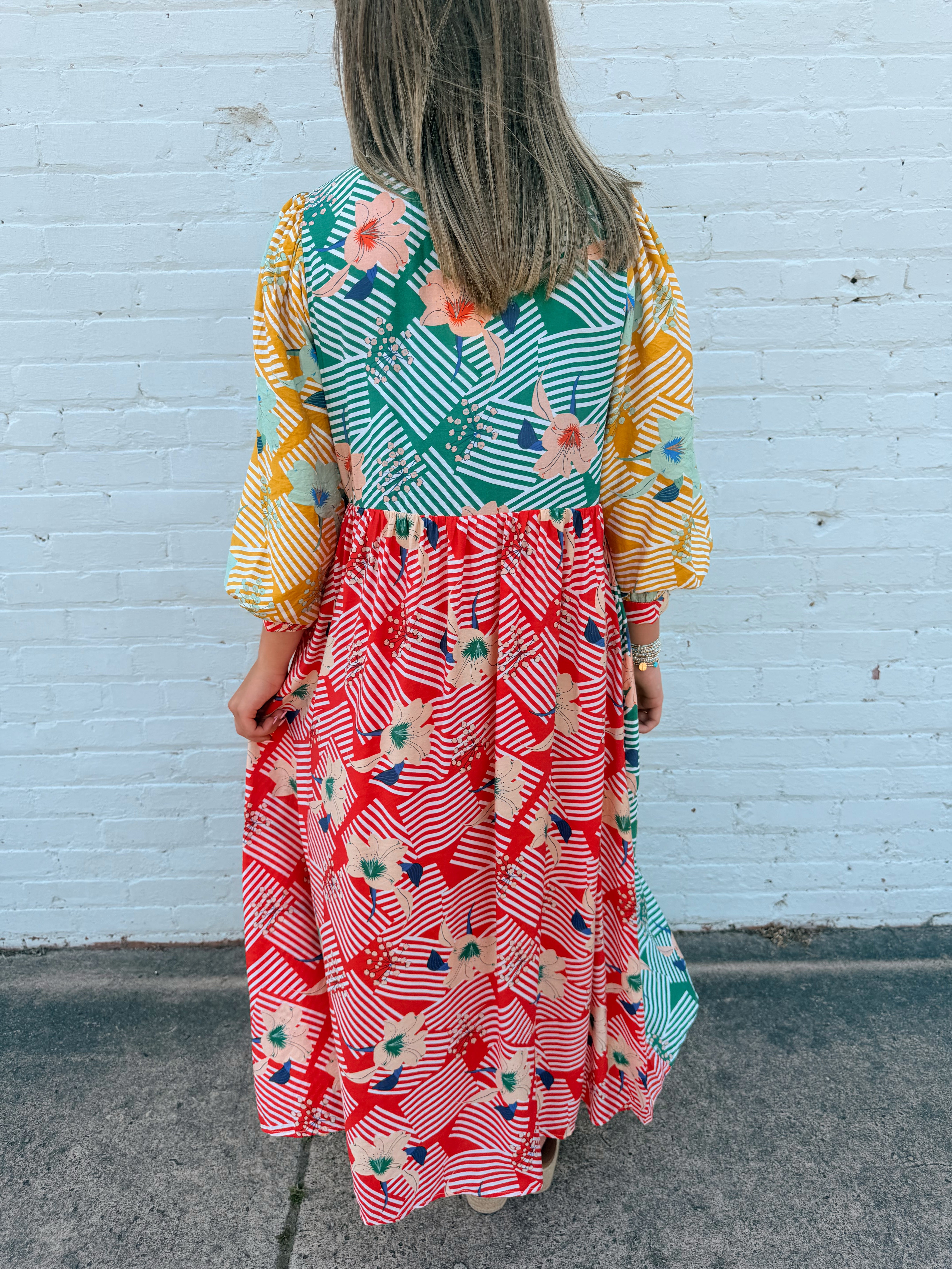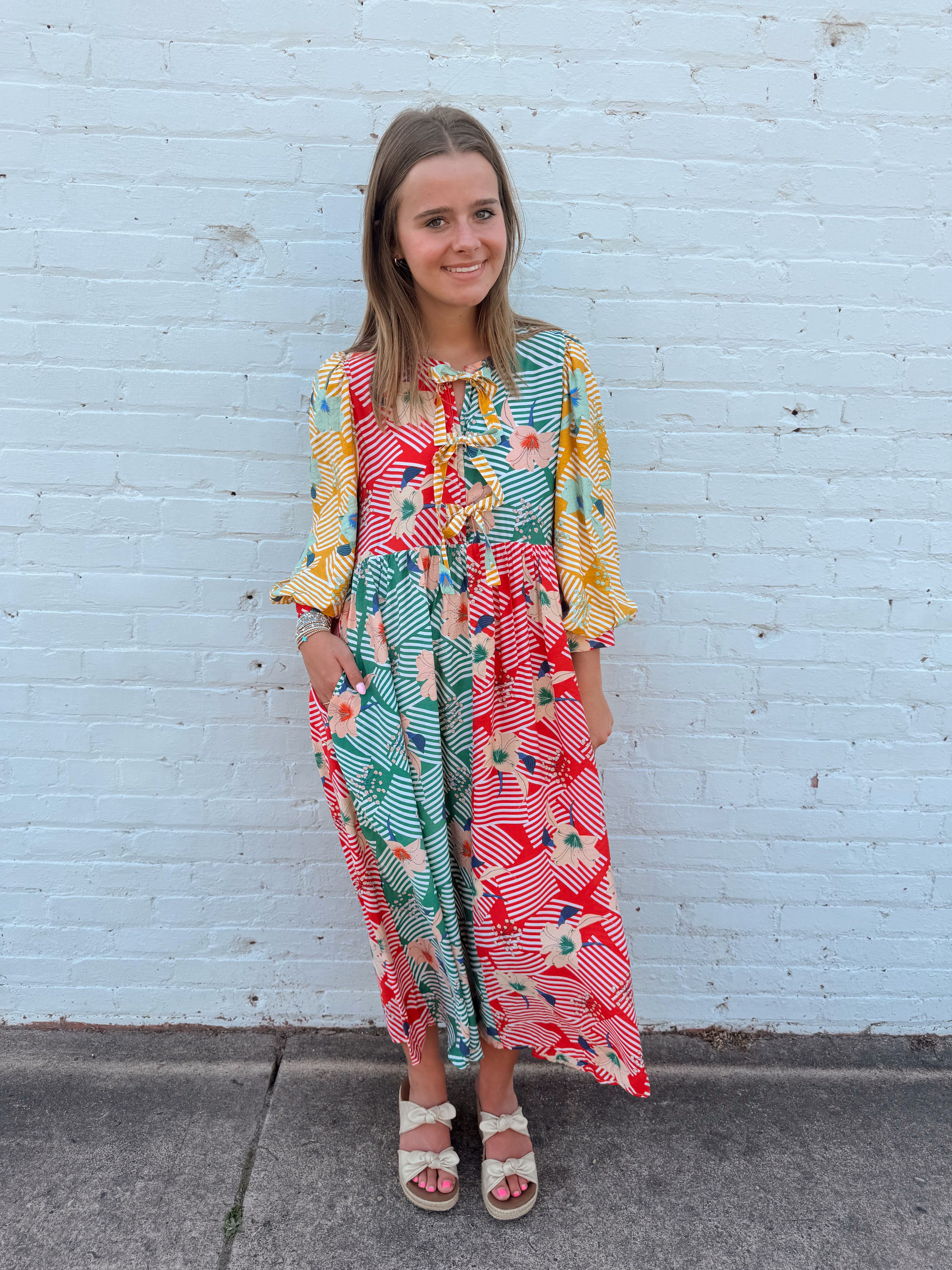 Bright, playful, and full of charm, the Garden Party Colorblock Midi Dress is a statement piece for spring and summer. Featuring 3/4 puff sleeves, a flattering midi length, and a mix of vibrant floral and stripe prints, this dress brings effortless personality to your wardrobe. The front bow tie detail adds a feminine touch, while the relaxed silhouette keeps it comfortable for all-day wear.