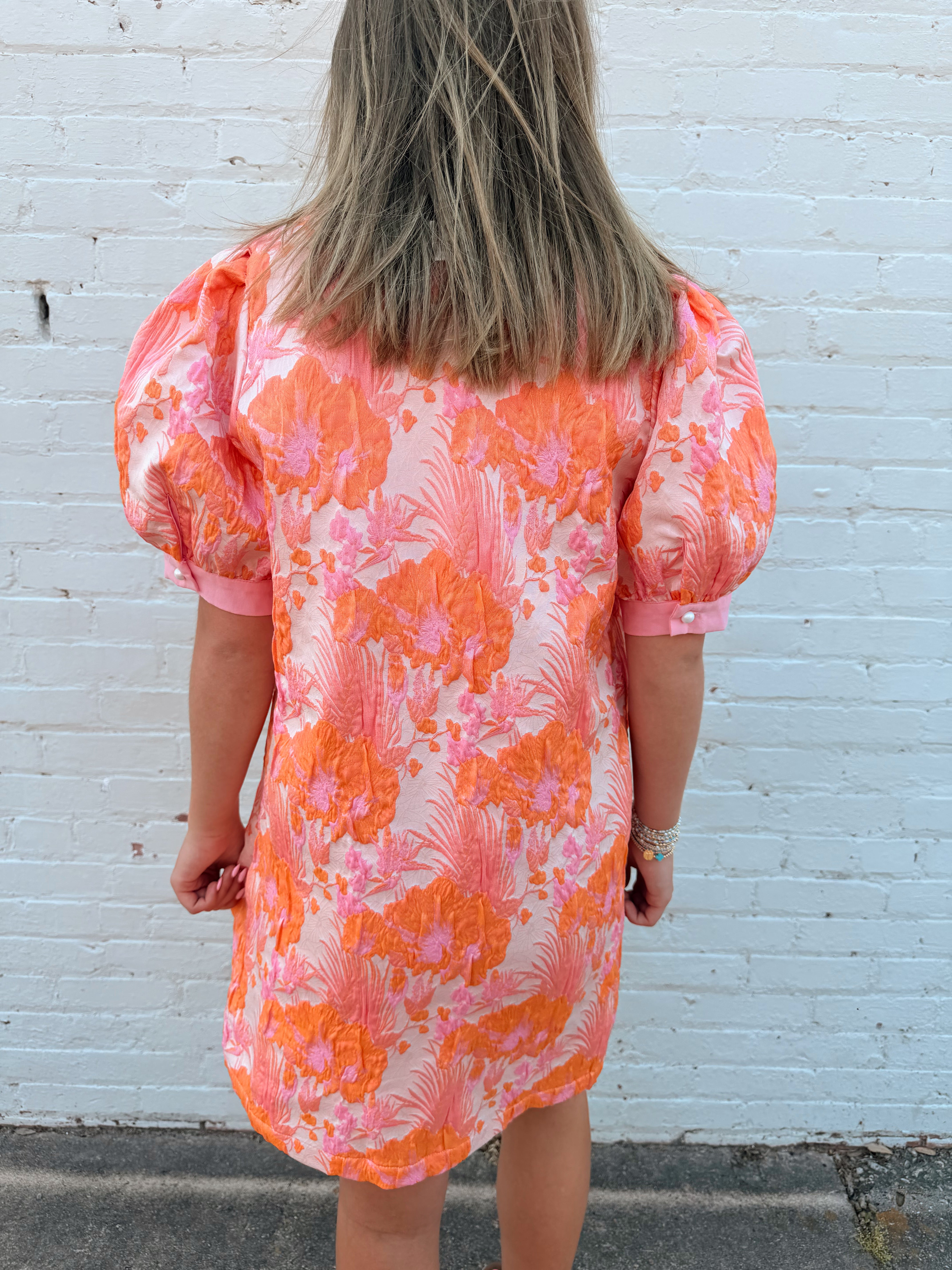 Turn heads in the Sunset Bloom Jacquard Dress, a beautifully textured style made for spring events, brunch dates, and sunny getaways. This floral jacquard dress features short puff sleeves, a flattering v-notched neckline, and contrast trim for an elevated touch. The easy shift silhouette keeps it comfortable and chic, while side pockets add the everyday practicality we all love.