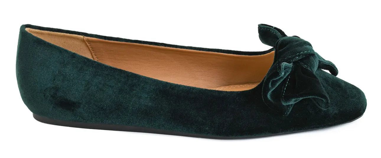 Step into timeless elegance with these rich evergreen velvet flats, topped with the sweetest oversized bow. They’re the perfect blend of cozy comfort + dressed-up chic, giving you a holiday-ready look without the heels.