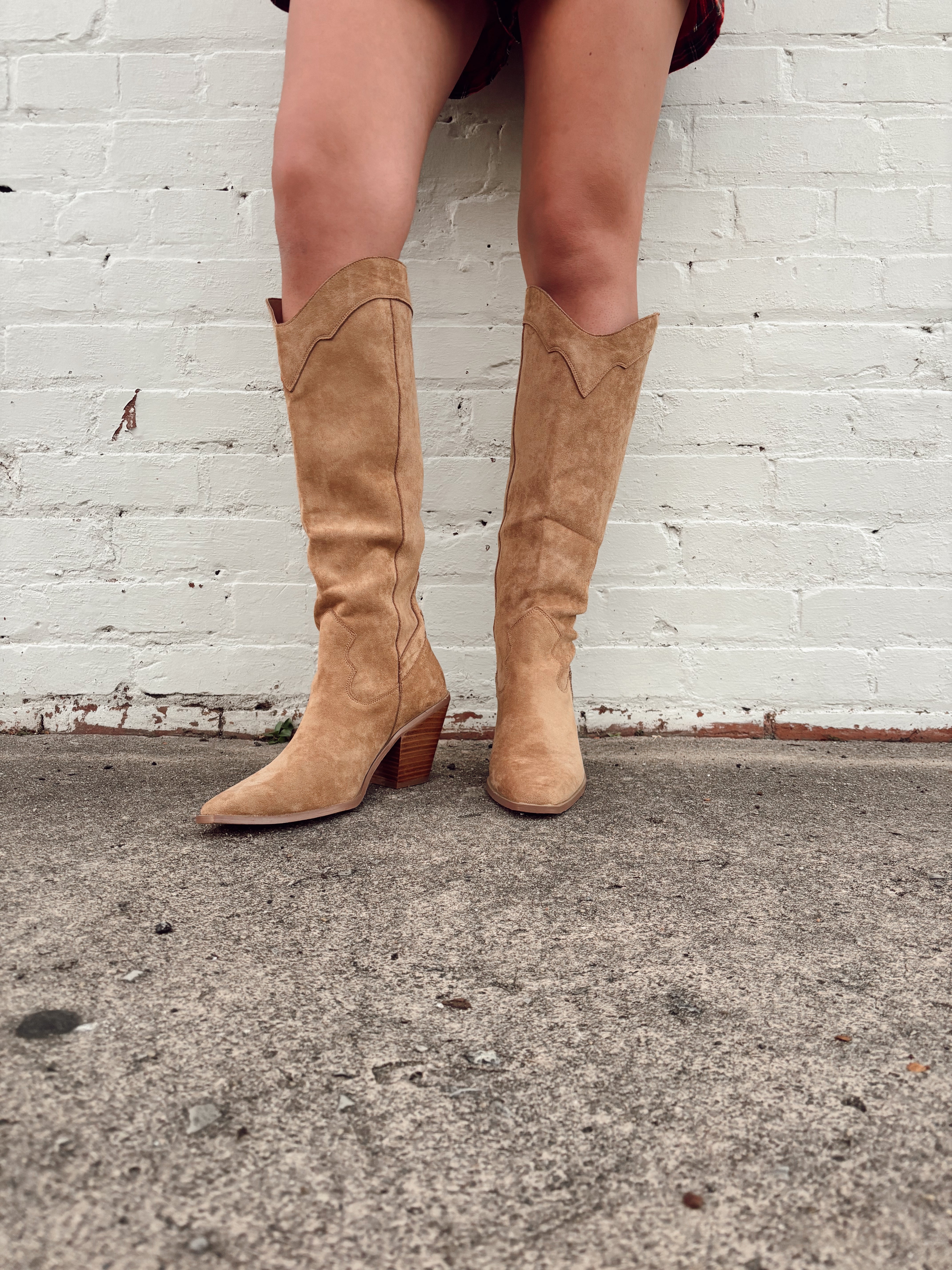 Step into timeless style with The Classy Suede Western Boot — where southern charm meets modern sophistication. Crafted from soft, neutral-toned suede, this knee-high boot adds effortless polish to any outfit. The subtly curved western stitching and pointed toe create that iconic cowgirl silhouette, while the stacked mid-block heel gives you a confident lift without sacrificing comfort.
