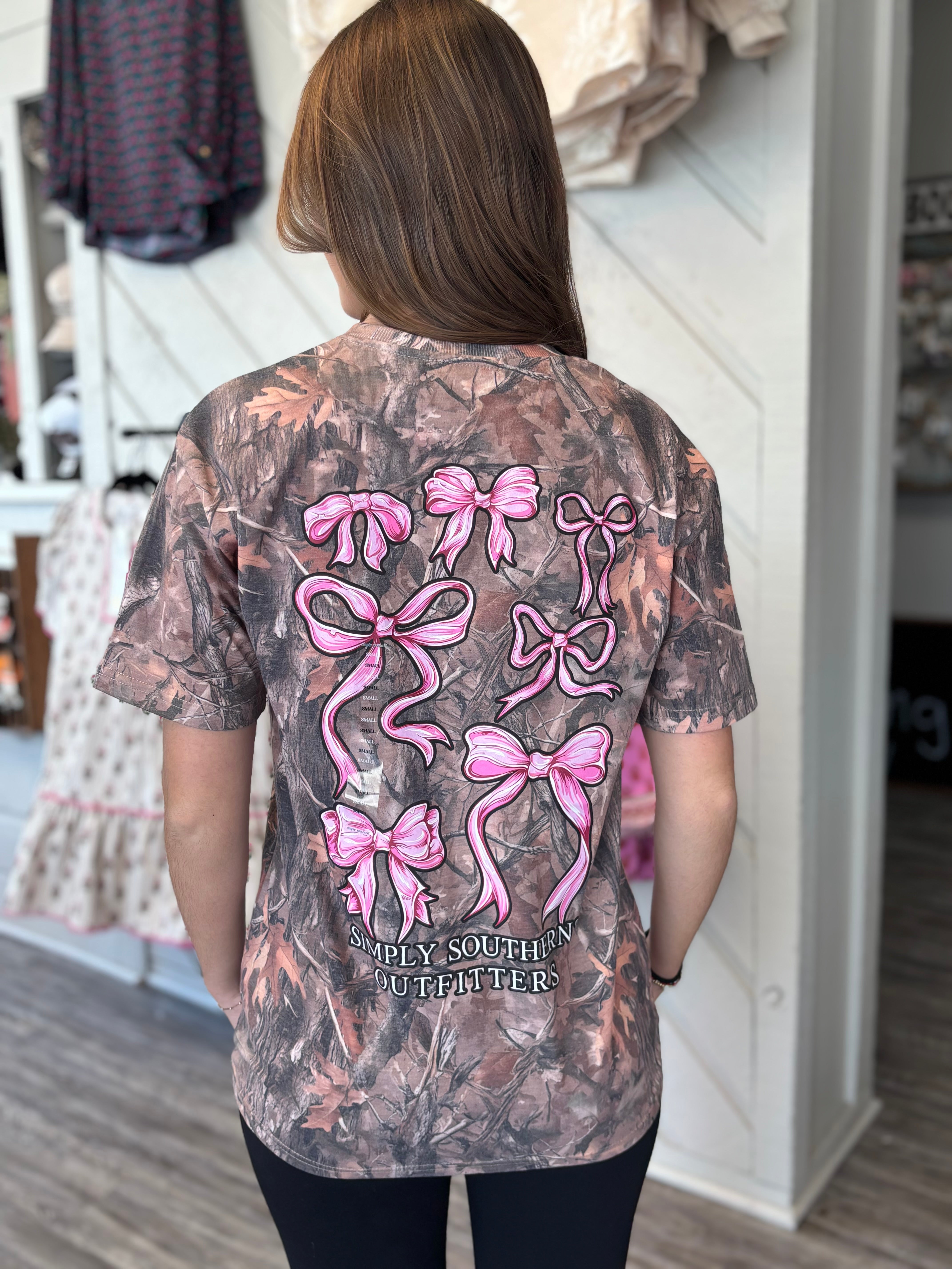 Camo short sleeve shirt with an array of pink bows and ribbons. Simply Southern logo below. Similar design on left chest. 100% cotton. Unisex sizing.
