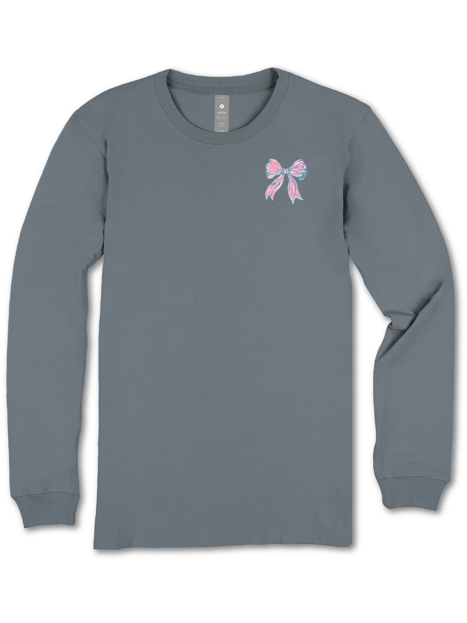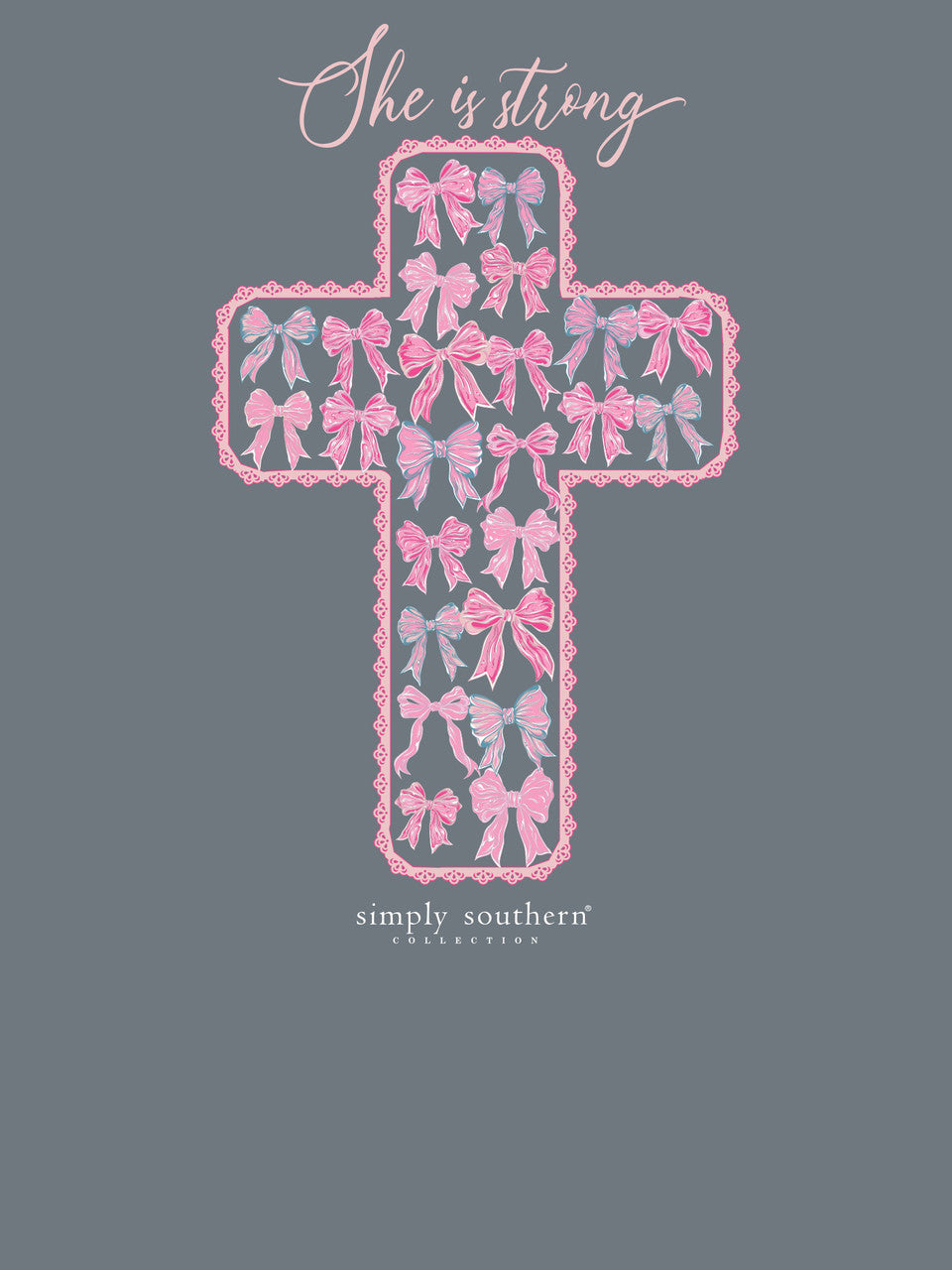 Mirage long sleeve shirt with the phrase 'She is strong' and a cross filled with hair bows. Simply Southern logo below. Hair bows on left chest and along right sleeve. 100% cotton. Unisex sizing.