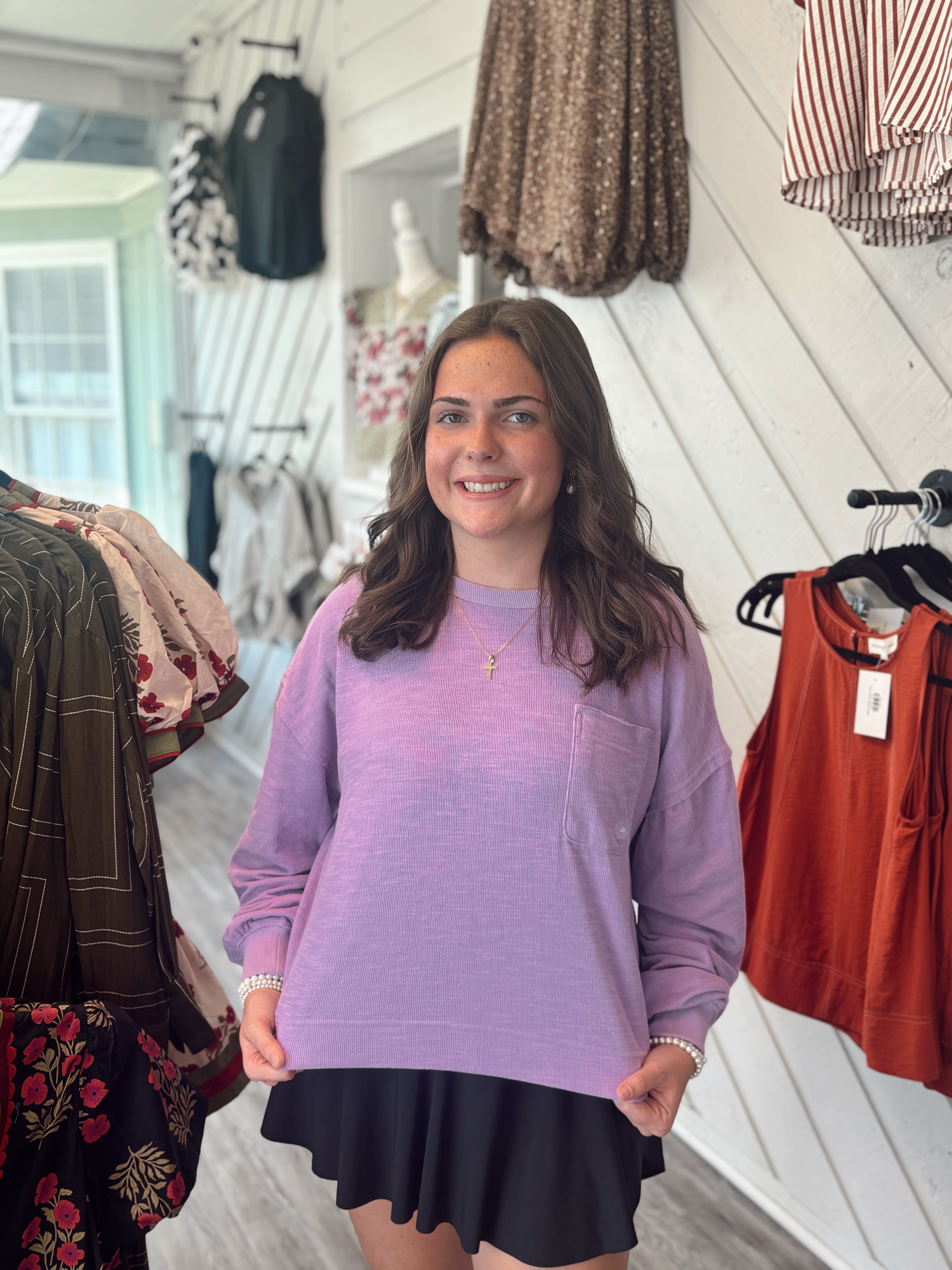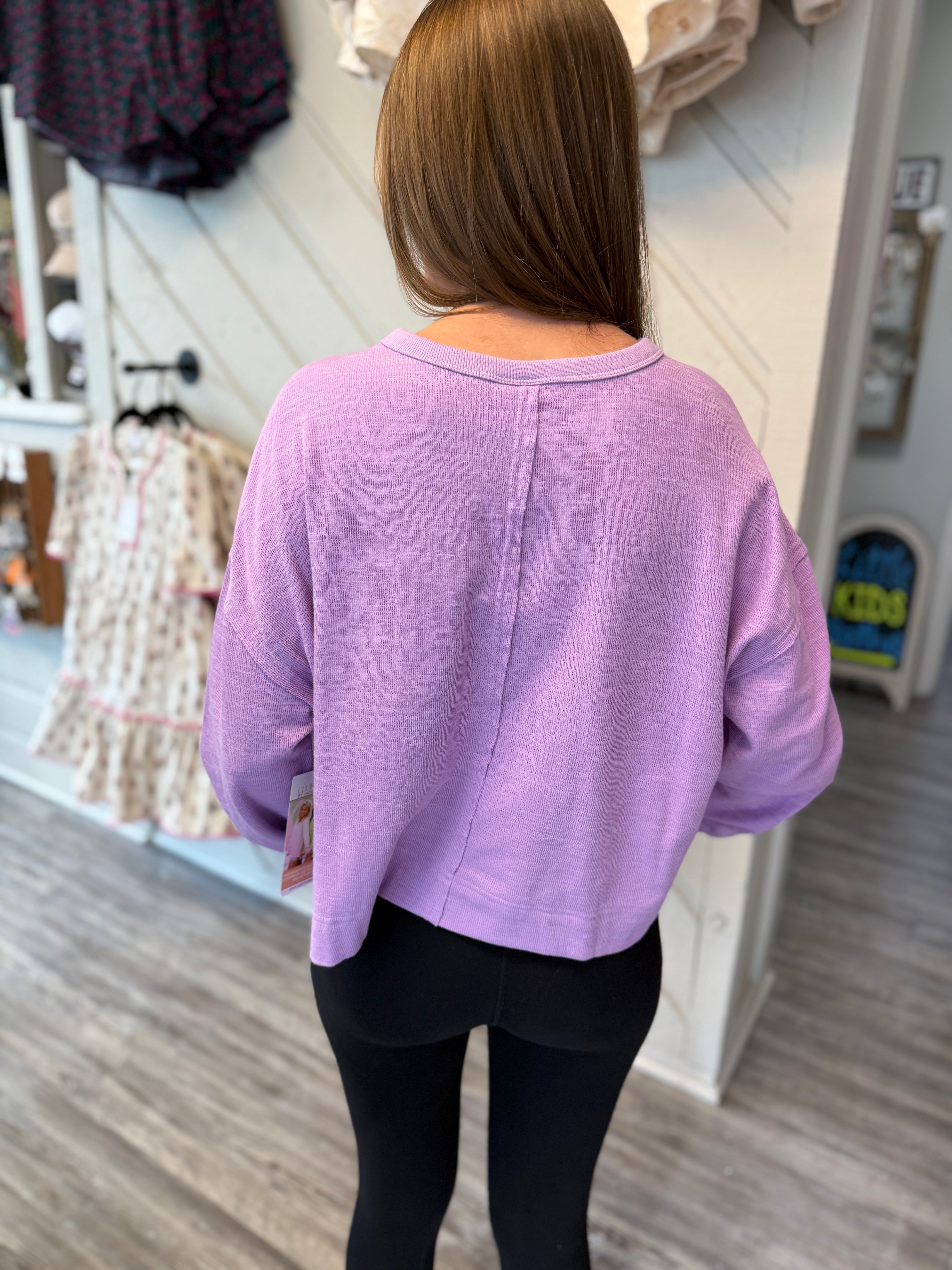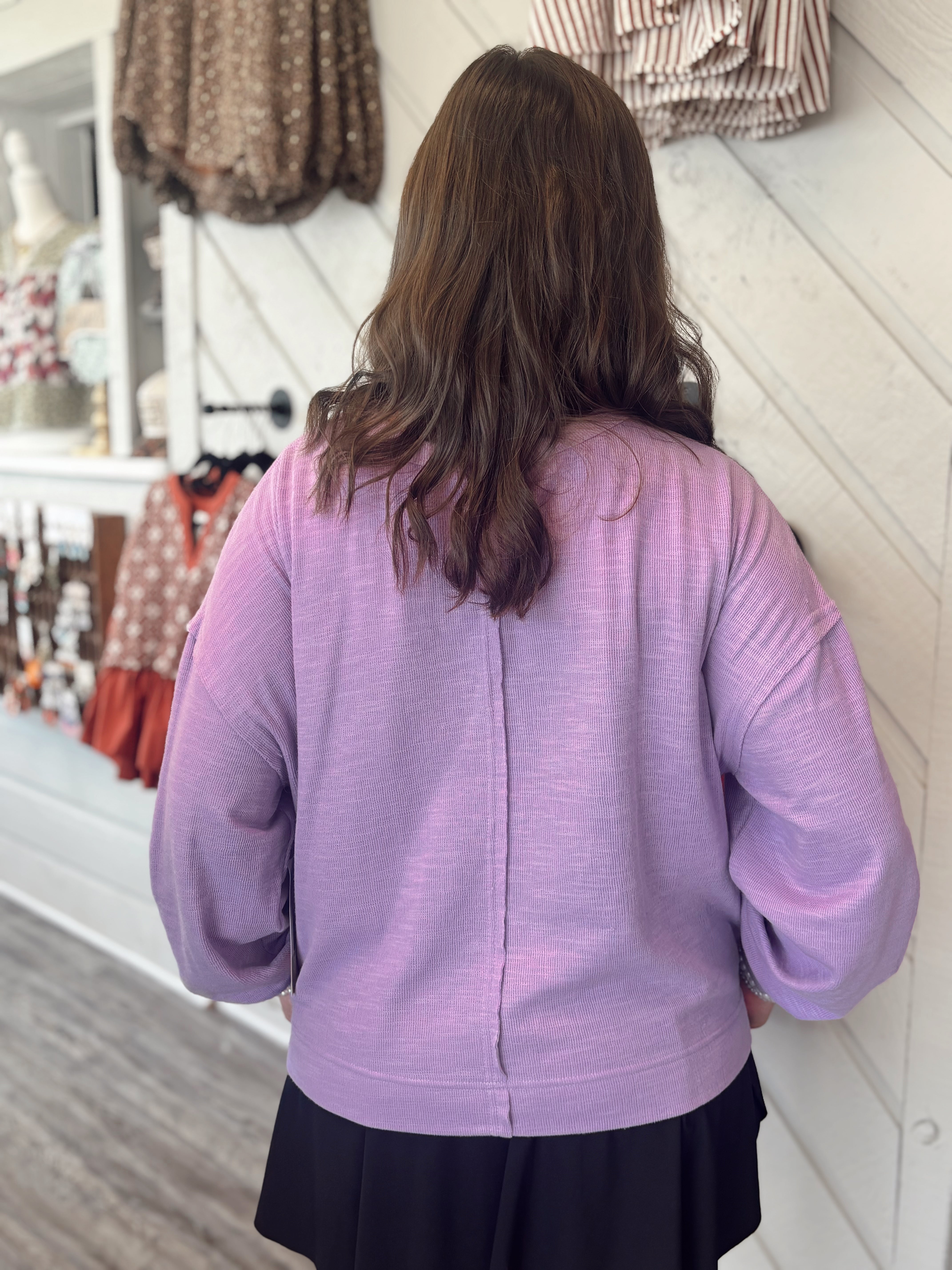 Laid-back comfort meets effortless style with the Long Weekend Knit Sweatshirt. Designed with a relaxed, roomy fit, this lightweight knit is perfect for cozy mornings, casual outings, or layering on cooler evenings. The lavender hue adds a fresh pop of color to your everyday wardrobe.