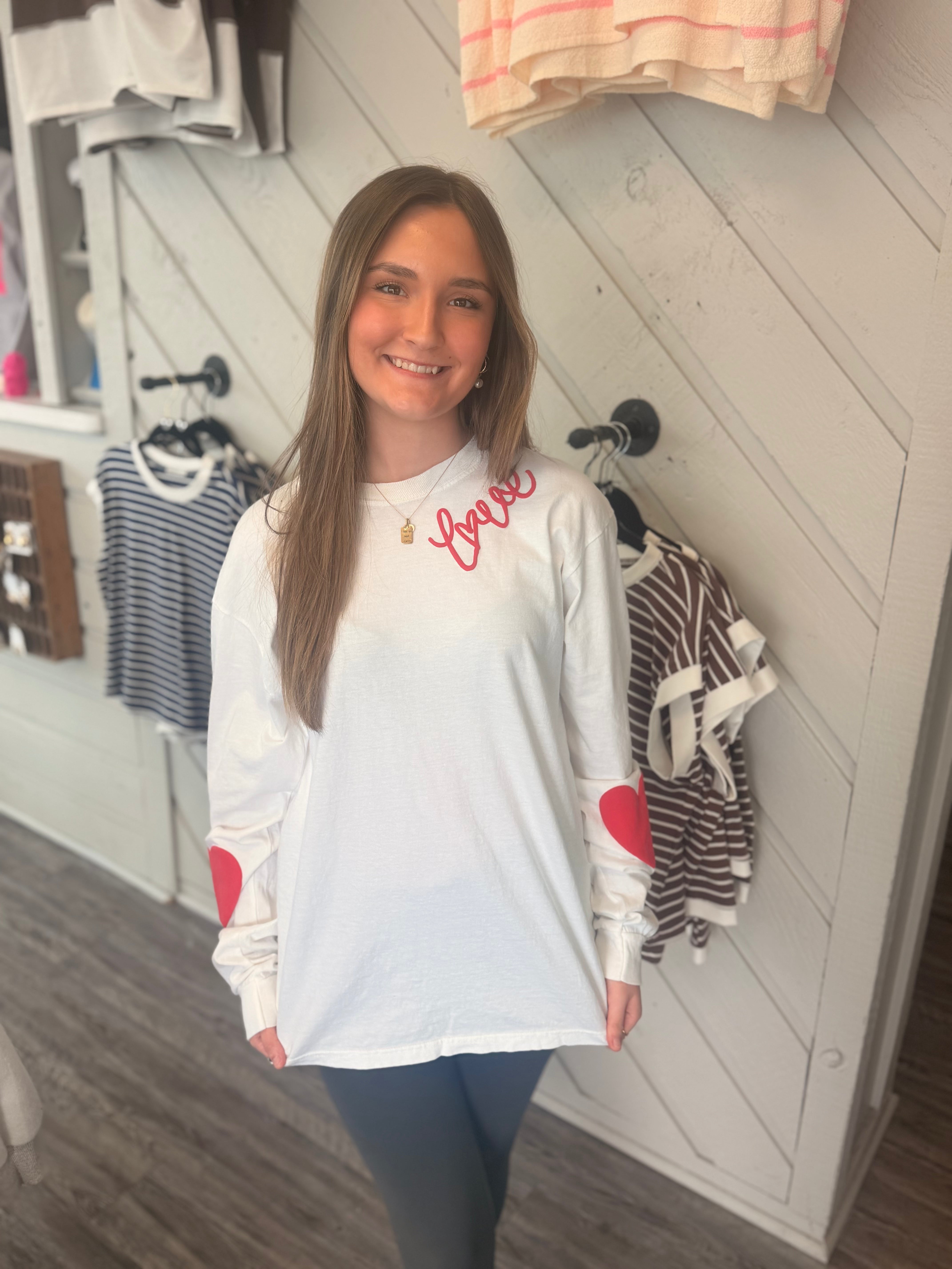 Soft, simple, and full of love — the Sweet on You Heart Sleeve Top is the perfect feel-good piece for Valentine’s season and beyond. This lightweight white long-sleeve top features delicate red “love” script embroidery near the neckline and bold red heart patches on the sleeves for the cutest pop of charm.