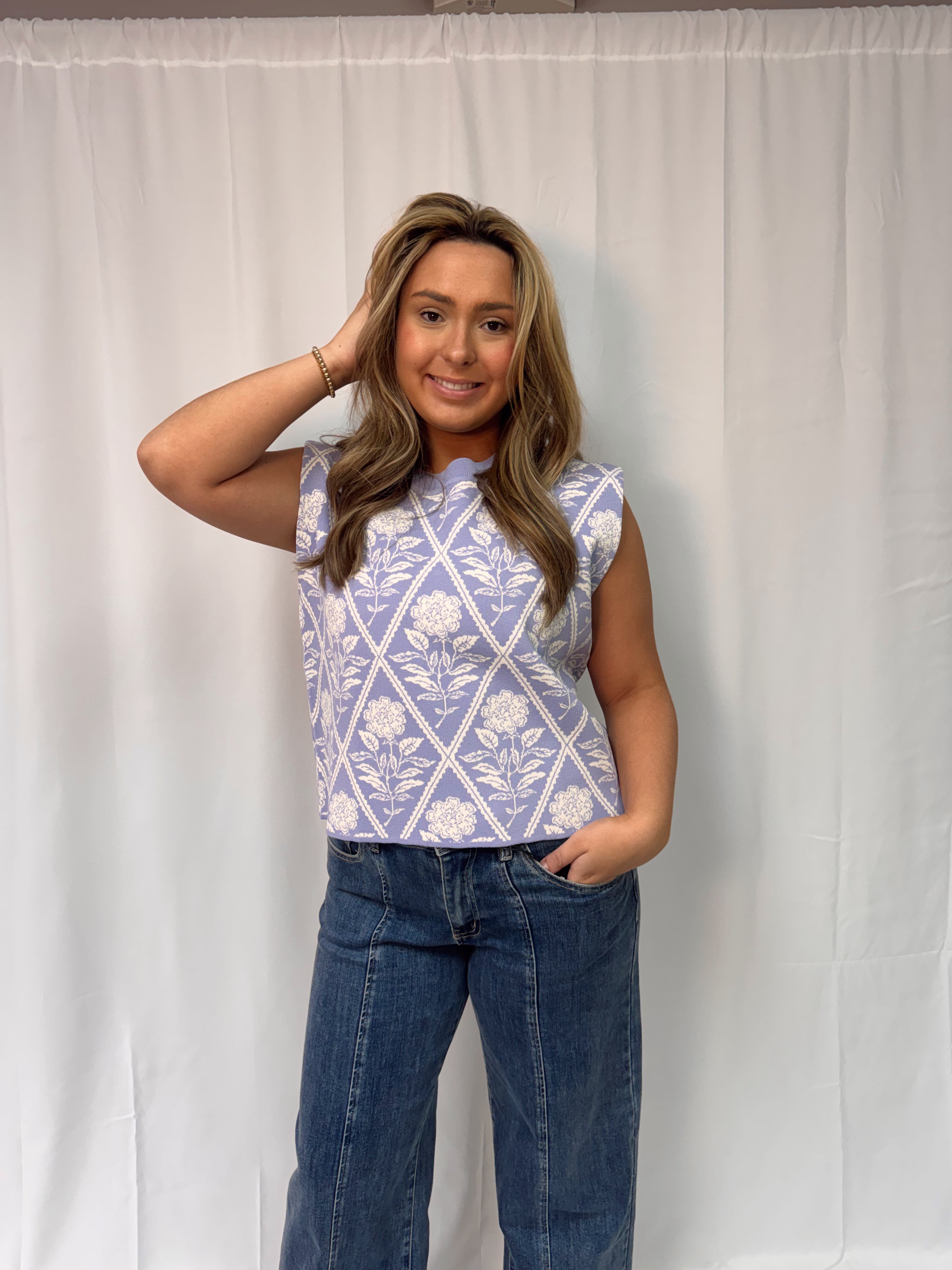 Soft and charming with a touch of vintage flair, our Lavender Garden Knit Vest is a must-have layering piece for the season. Designed in a dreamy lavender hue with an ivory floral lattice pattern, this sleeveless knit vest features a ribbed crew neckline, arm openings, and hem for a polished finish. The lightweight knit makes it perfect for transitional styling—layer it over a button-down or wear it solo with denim for an effortlessly chic look.