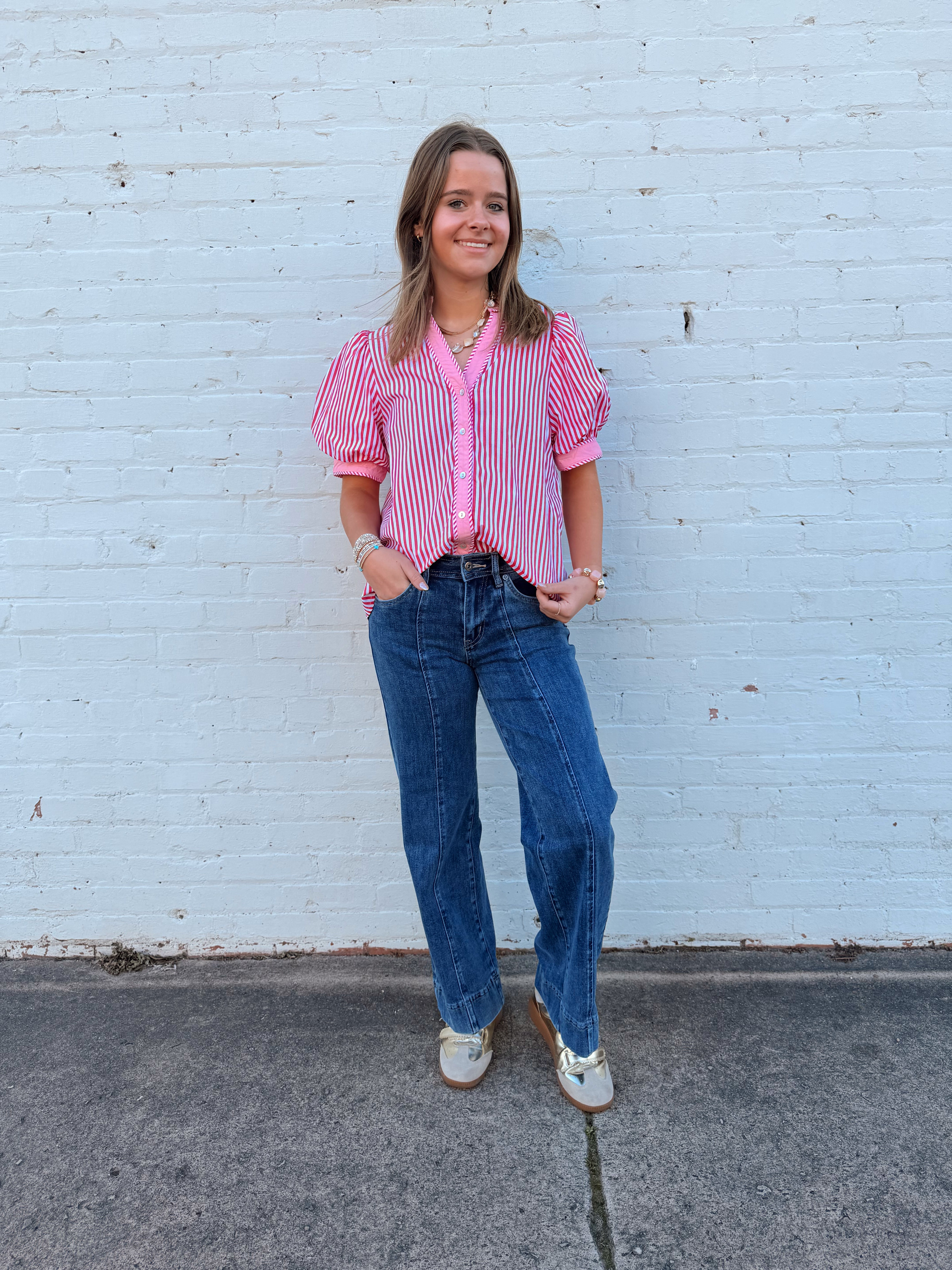 Sweet, classic, and effortlessly polished — the Candy Stripe Darling Puff Sleeve Top is the kind of piece that instantly makes an outfit feel styled. Featuring playful pink and white vertical stripes, a flattering split V-neckline with collar, and feminine puff sleeves, this top brings a fresh boutique-ready look you can wear year-round.