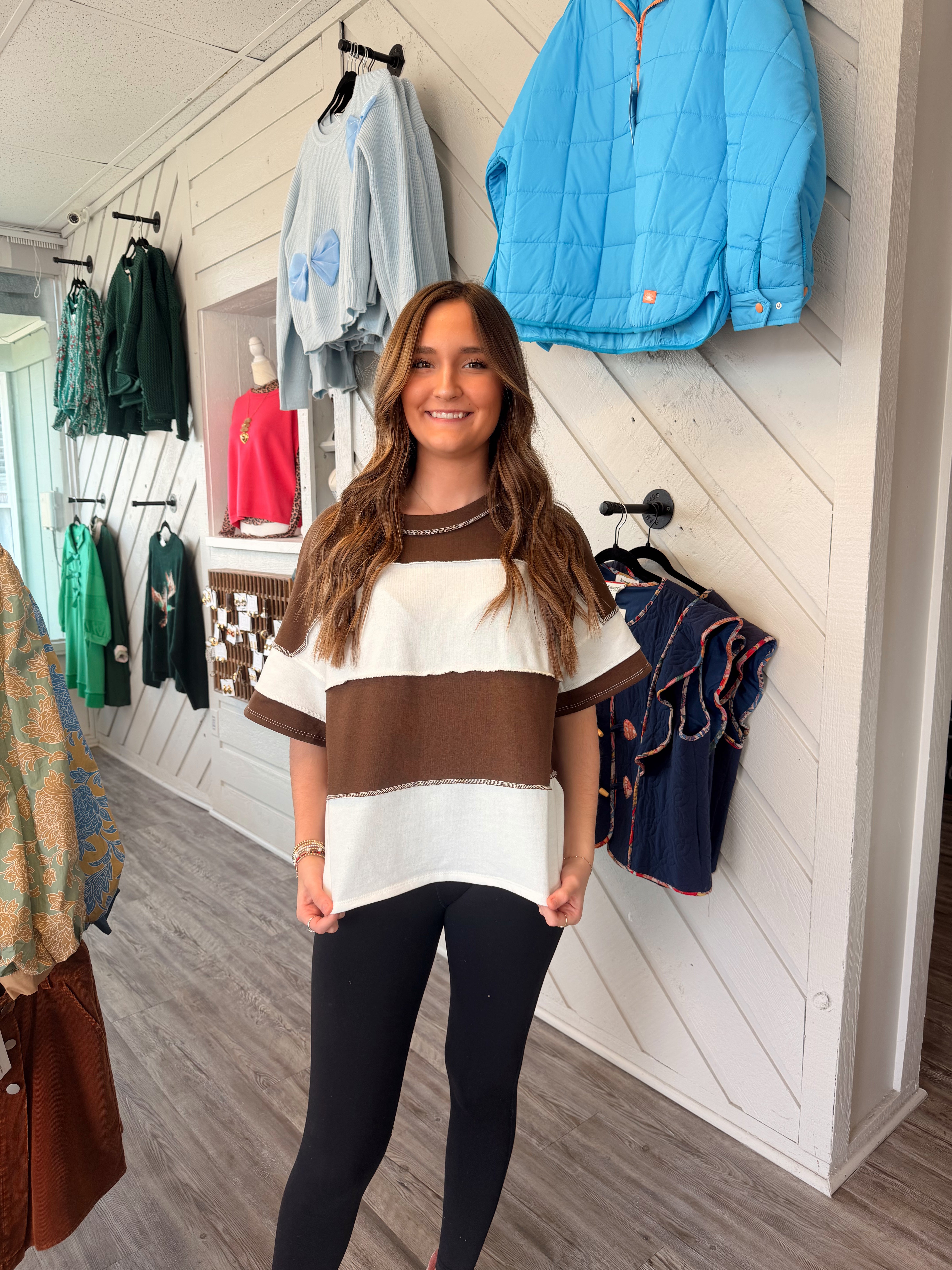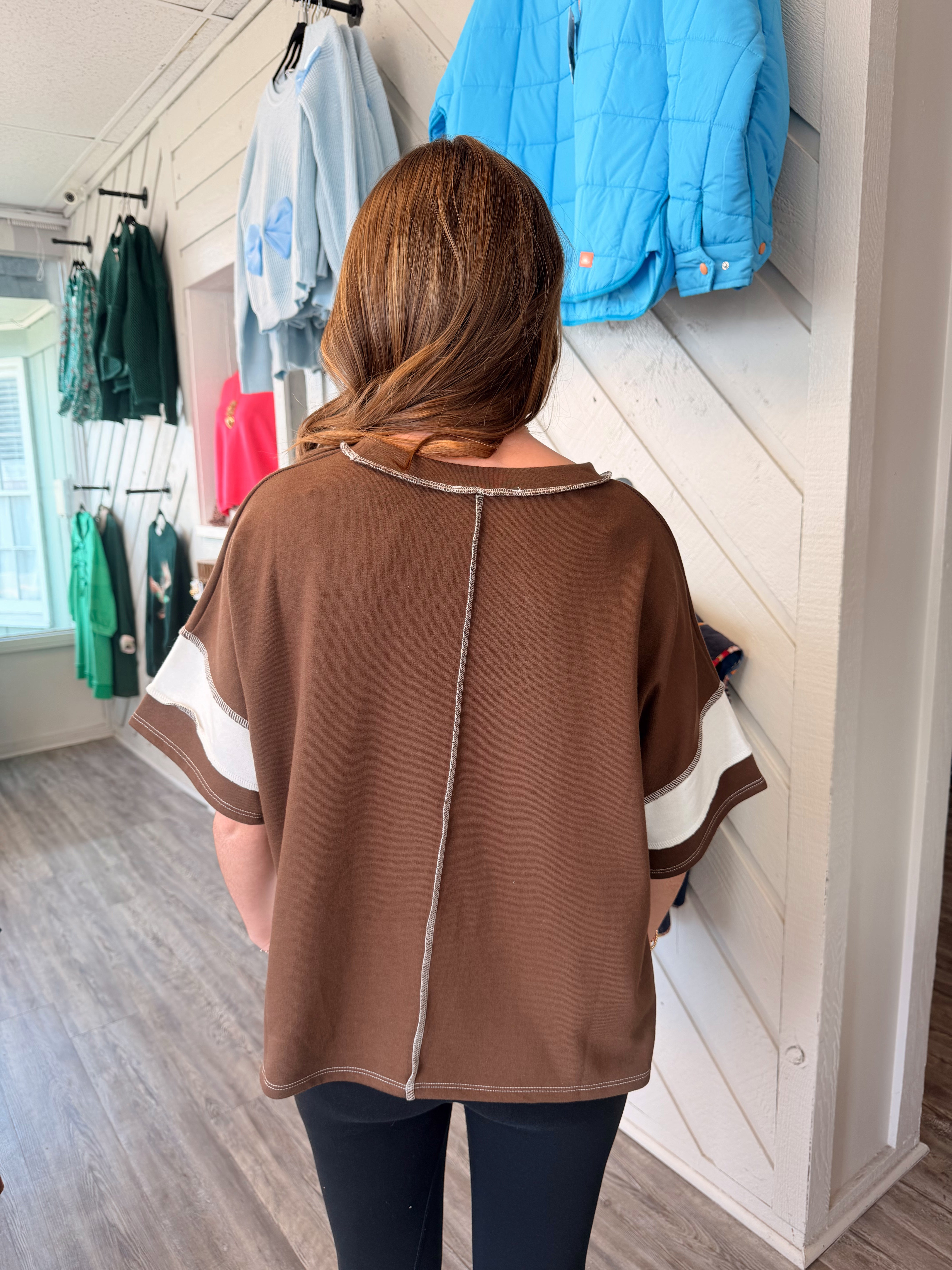Neutral lovers, this one’s for you. The Cocoa Cream Colorblock Tee features rich brown tones paired with soft cream panels for a timeless, elevated look. Exposed seam detailing adds a casual, worn-in feel that makes this top a standout staple.