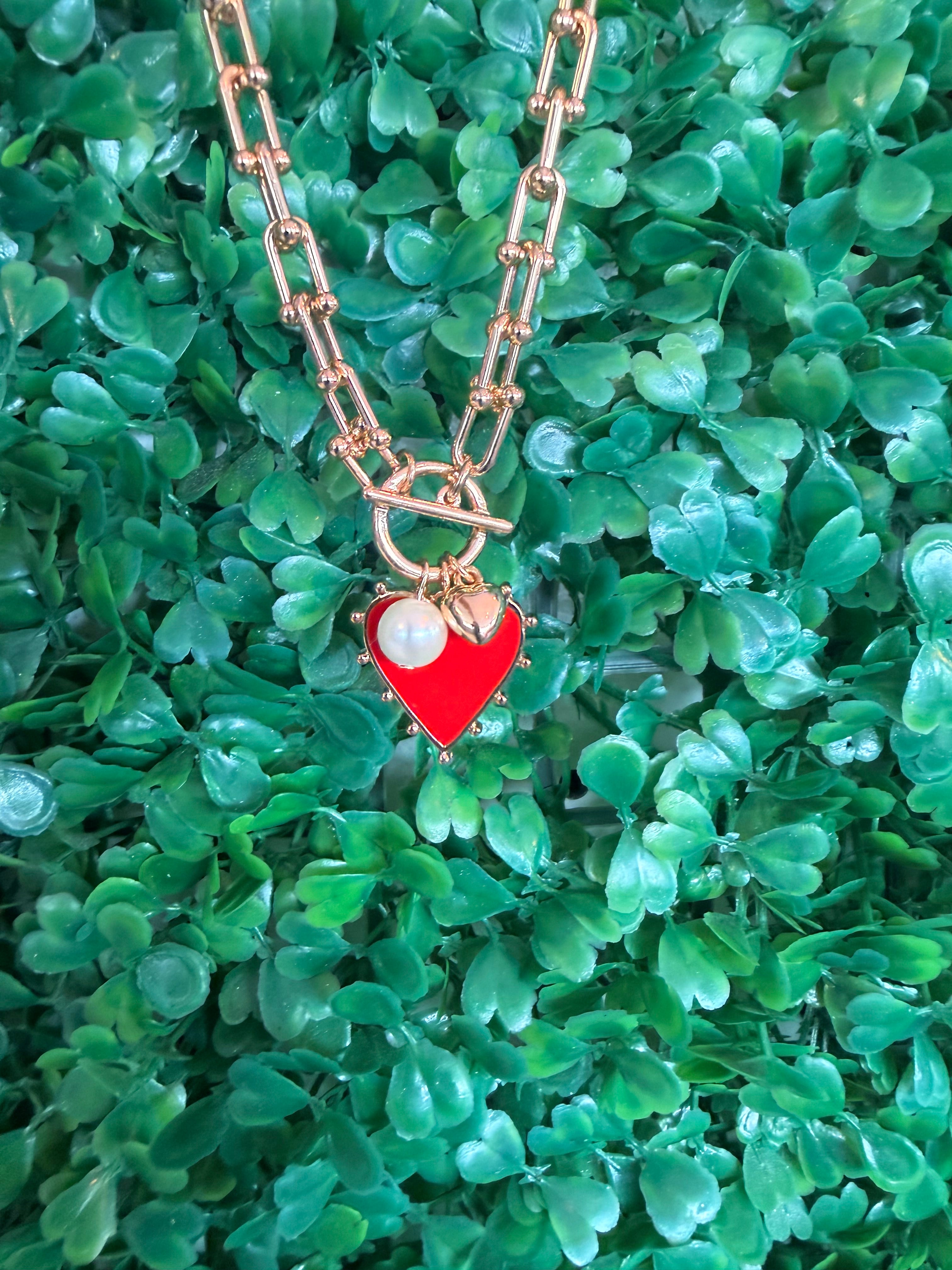 This pendant/charm necklace is a perfect blend of style and elegance. The gold chain beautifully complements the red studded heart charm, making it an eye-catching accessory. The adjustable length of 16"-18" ensures a comfortable fit.