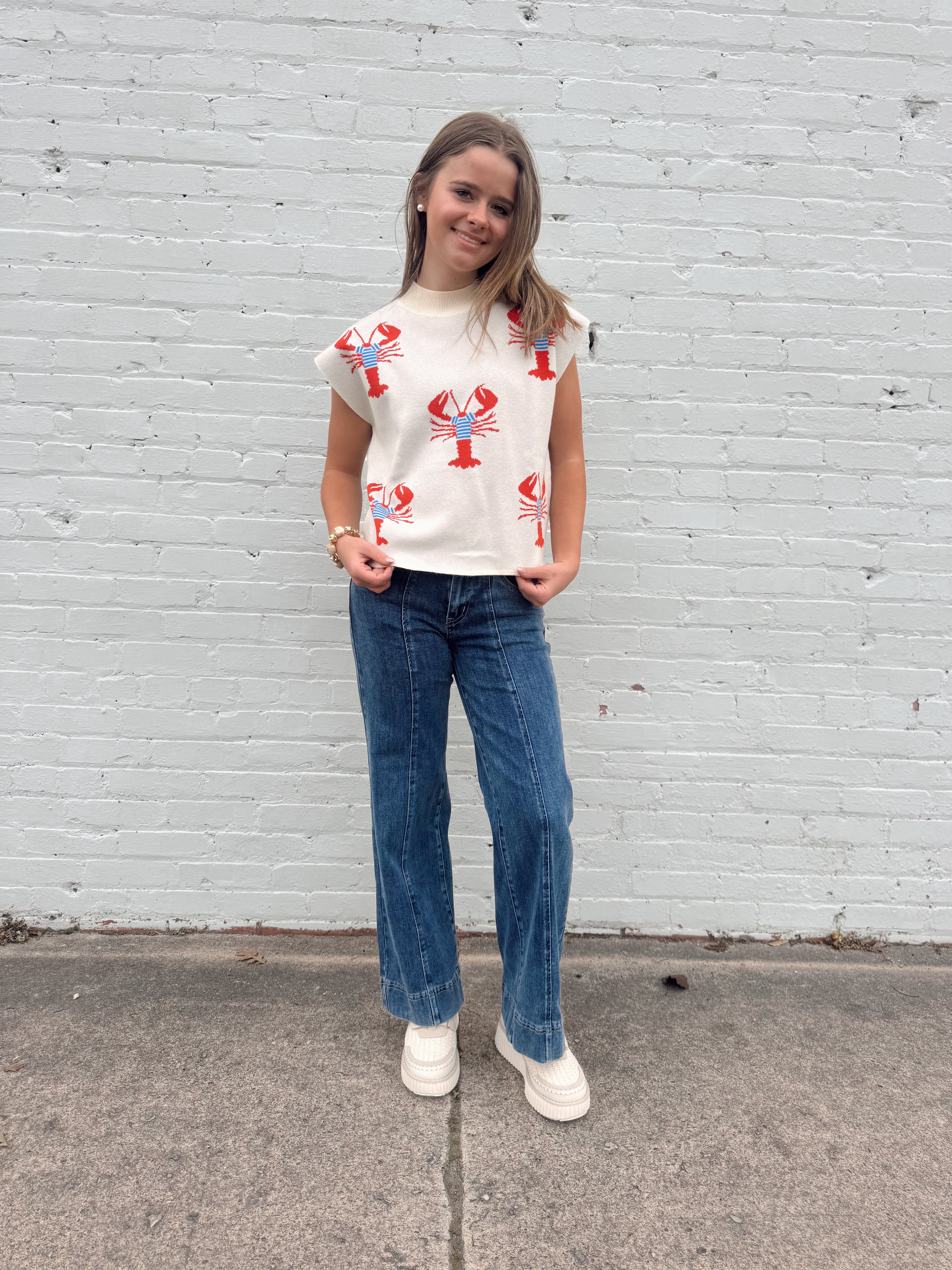 Classic coastal charm meets playful detail in our Seaside Lobster Knit Vest. Featuring a soft ivory knit base with an allover red lobster motif accented by subtle blue striping, this sleeveless vest is equal parts fun and timeless. Designed with a ribbed crew neckline and clean hem, it offers a relaxed, flattering fit that’s easy to style for warm-weather days.