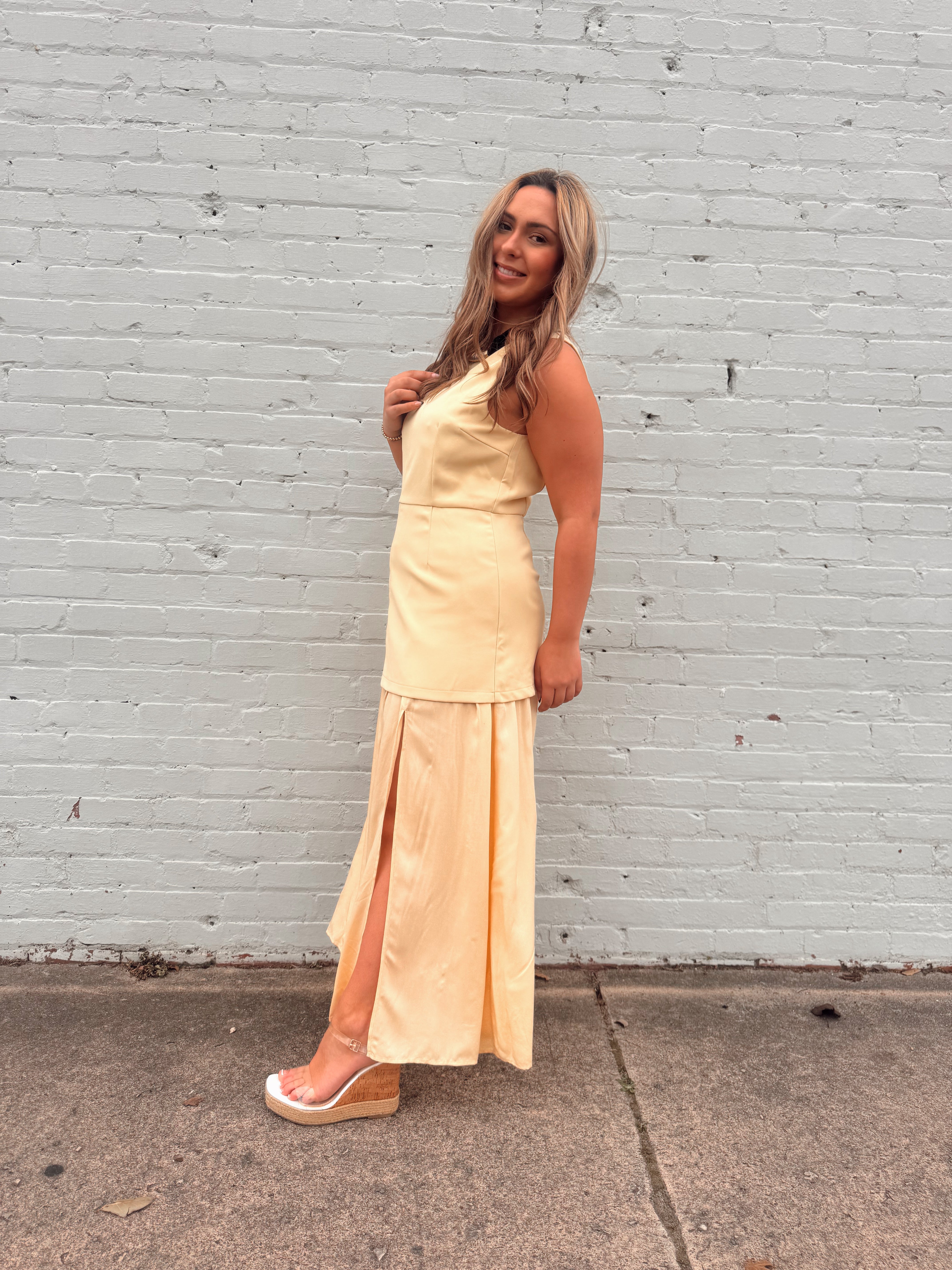 Effortlessly chic with a modern twist, the Sunlit Silhouette Layered Midi Dress gives the look of a two-piece set in a flattering one-piece design. Featuring a solid sleeveless bodice with a layered overlay, this dress creates a tailored yet flowy silhouette that moves beautifully with you.